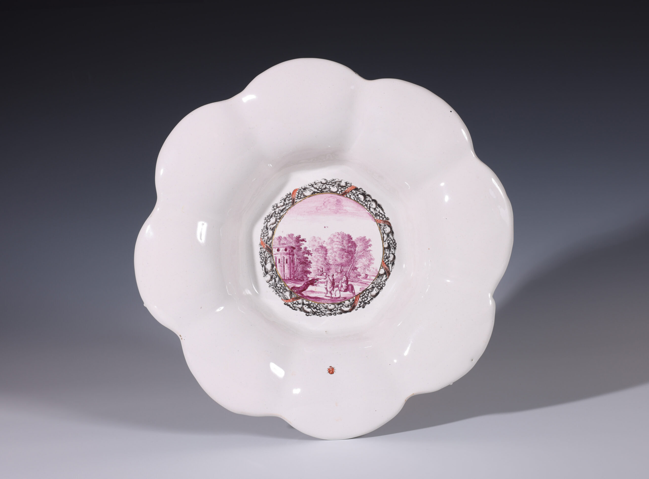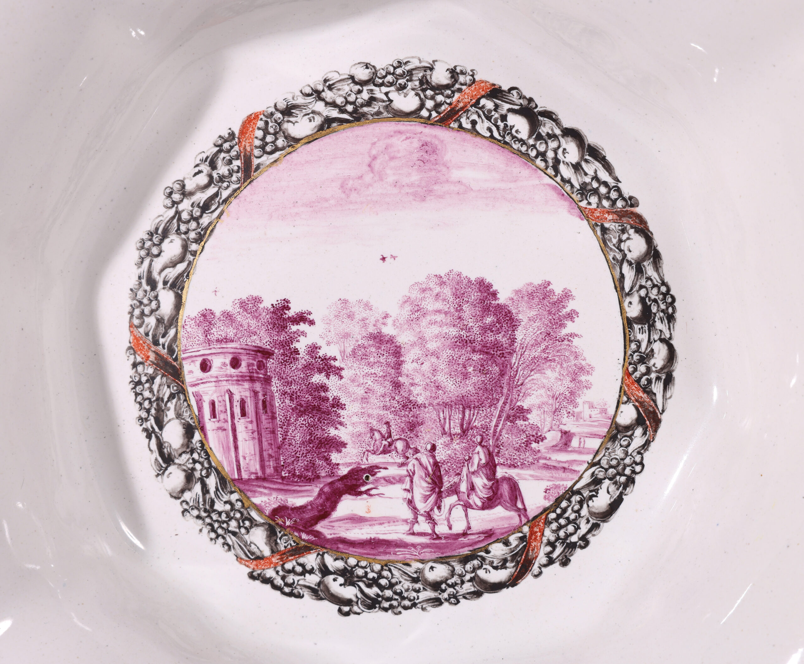 Decorated in puce with travellers before a classical building in a landscape within a wreath of fruit and flowers with gilt bands highlighted in red.
