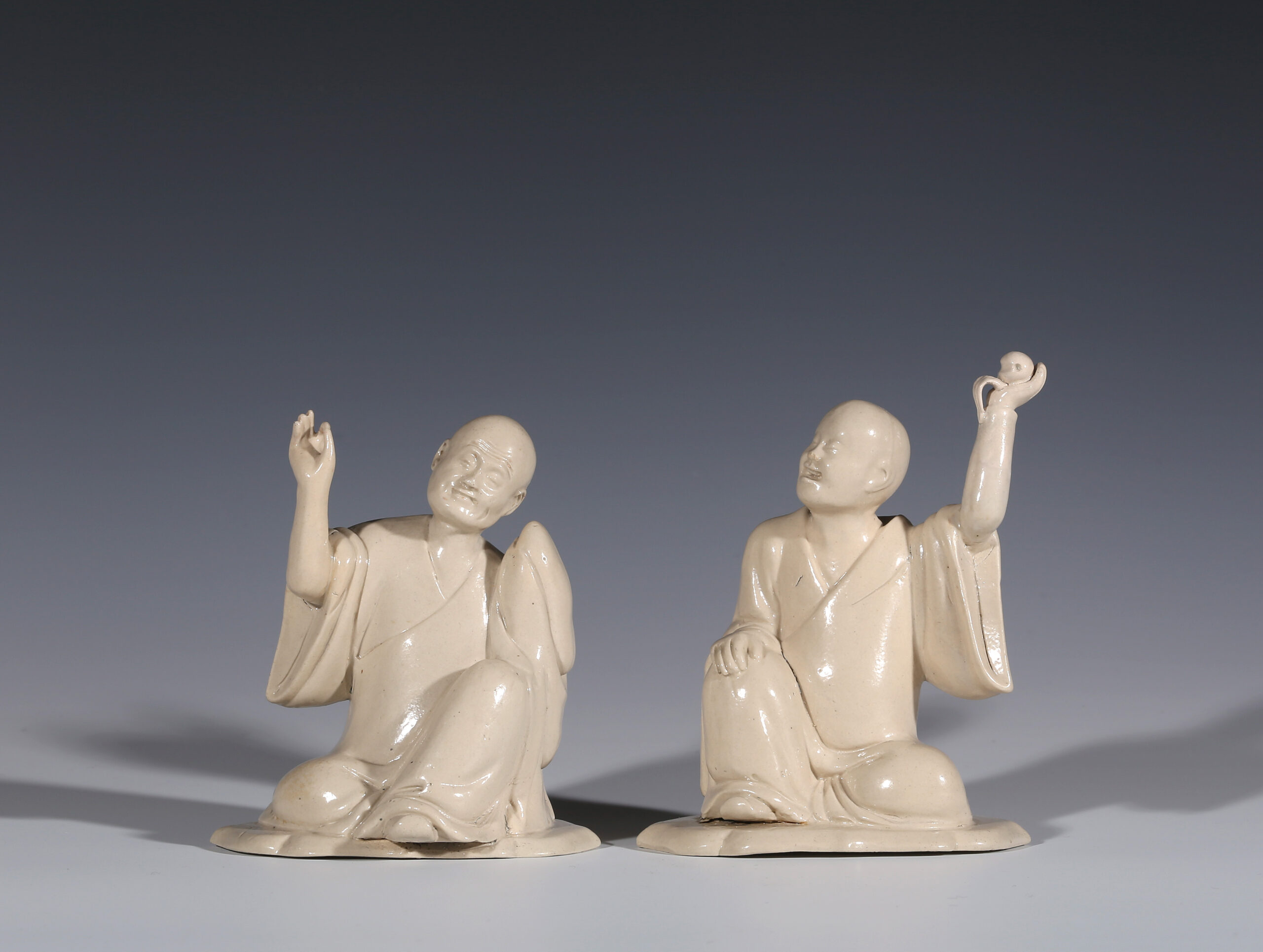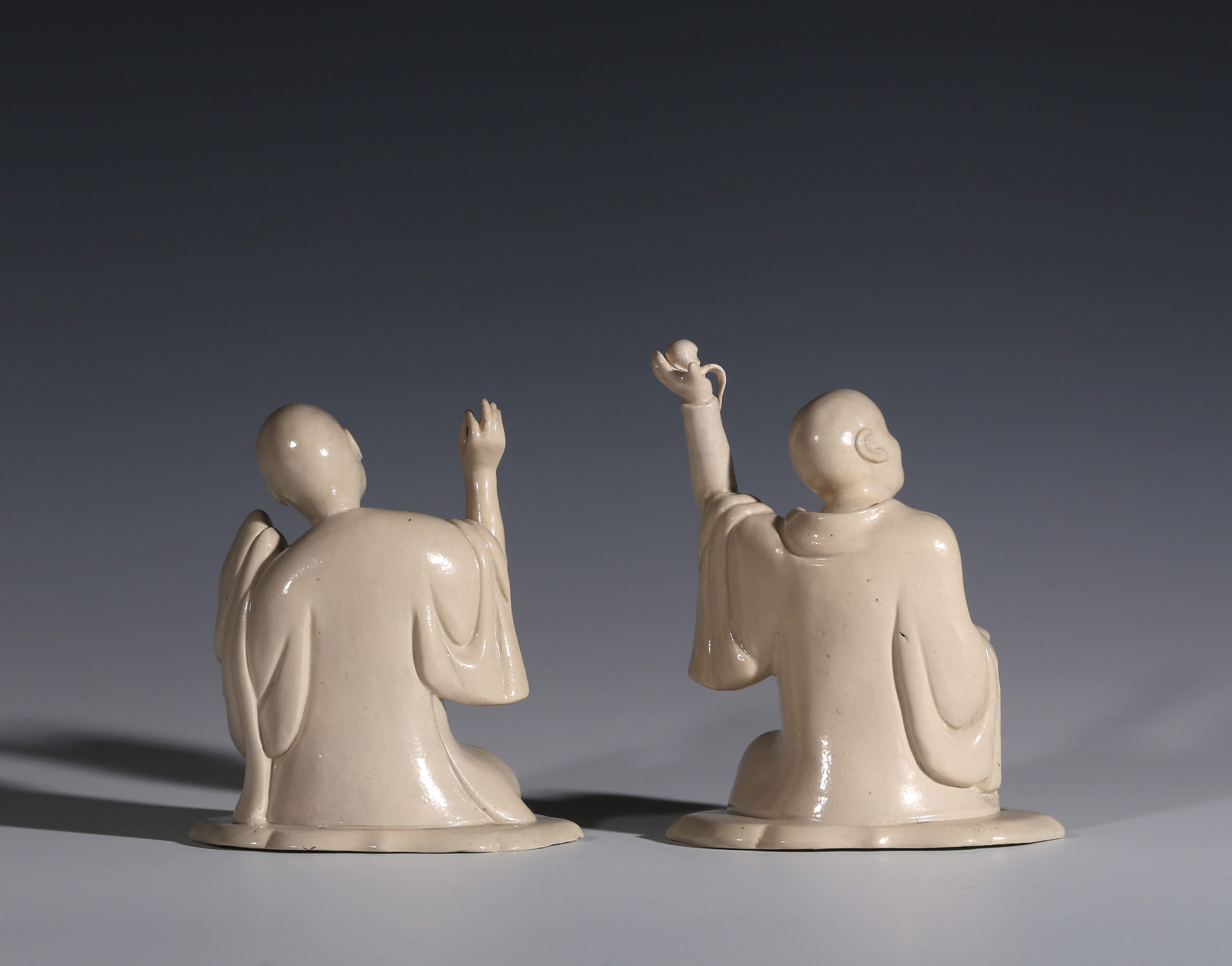 The finely characterised features of the face, notably on the figure with his right hand raised, is characteristic of Chinese hardwood or ivory carving, rather than Fujian blanc-de-chine porcelain which has sometimes been suggested as a source,