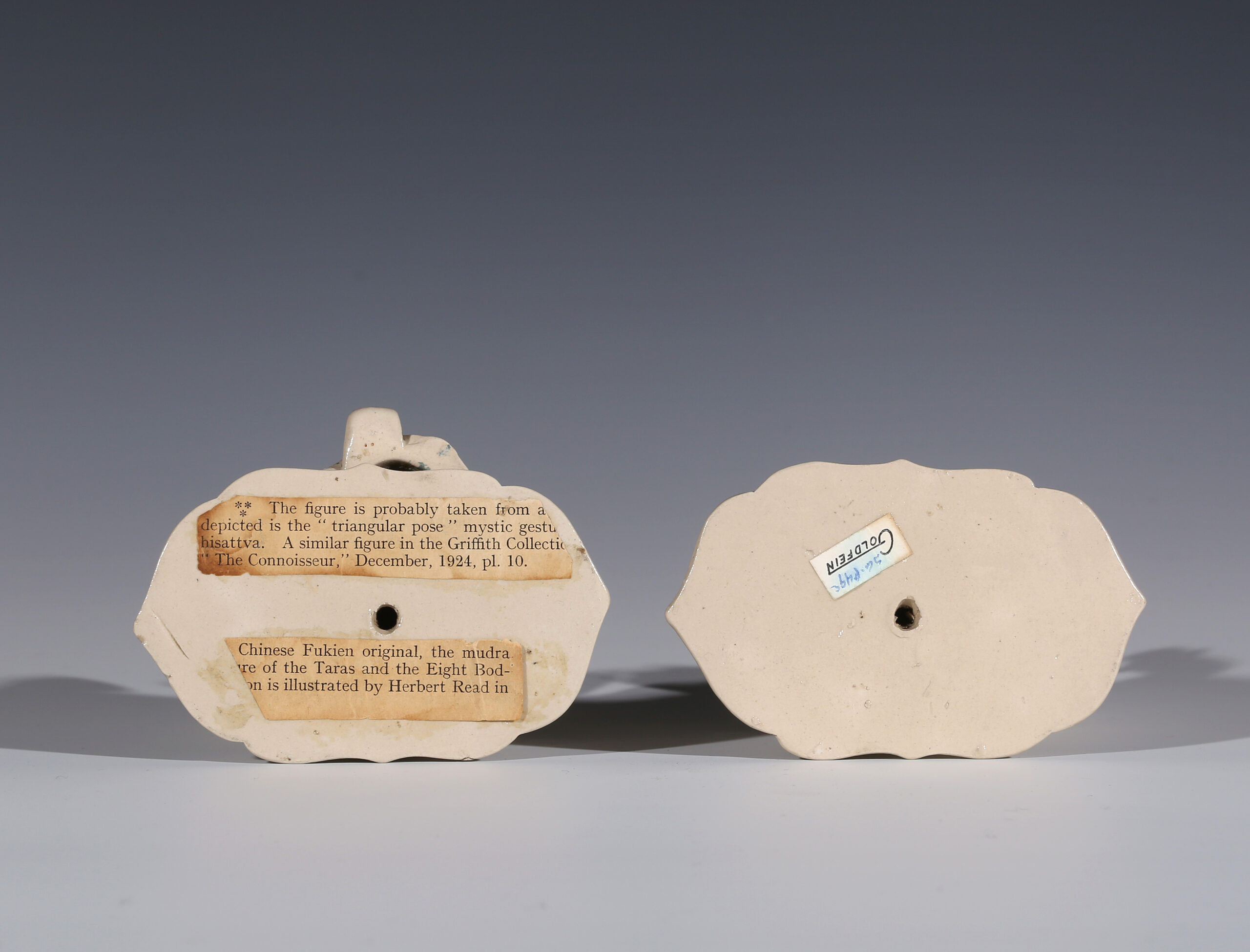 A pair of similar figures, one with traces of gold decoration, is in the The Potteries Museum & Art Gallery, Stoke-on-Trent[1], and another pair was published by Jonathan Horne in 2003.[2] A single figure of the same model as the one with his right hand raised is in the Burnap Collection.[3]