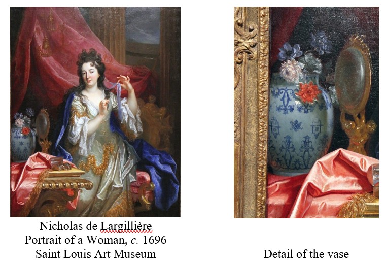 A blue and white vase of similar outline is depicted in the ‘Portrait of a Woman’ by Nicholas de Largillière, in the Saint Louis Art Museum. The Berainesque decoration suggests a French rather than a Chinese origin, but it’s unlikely to be faience in such a rich and fashionable setting. If porcelain, then Saint-Cloud is the obvious candidate.[3] The painting is dated to around 1696 – exactly the moment when such a Saint-Cloud vase would have enjoyed startling novelty and prestige.