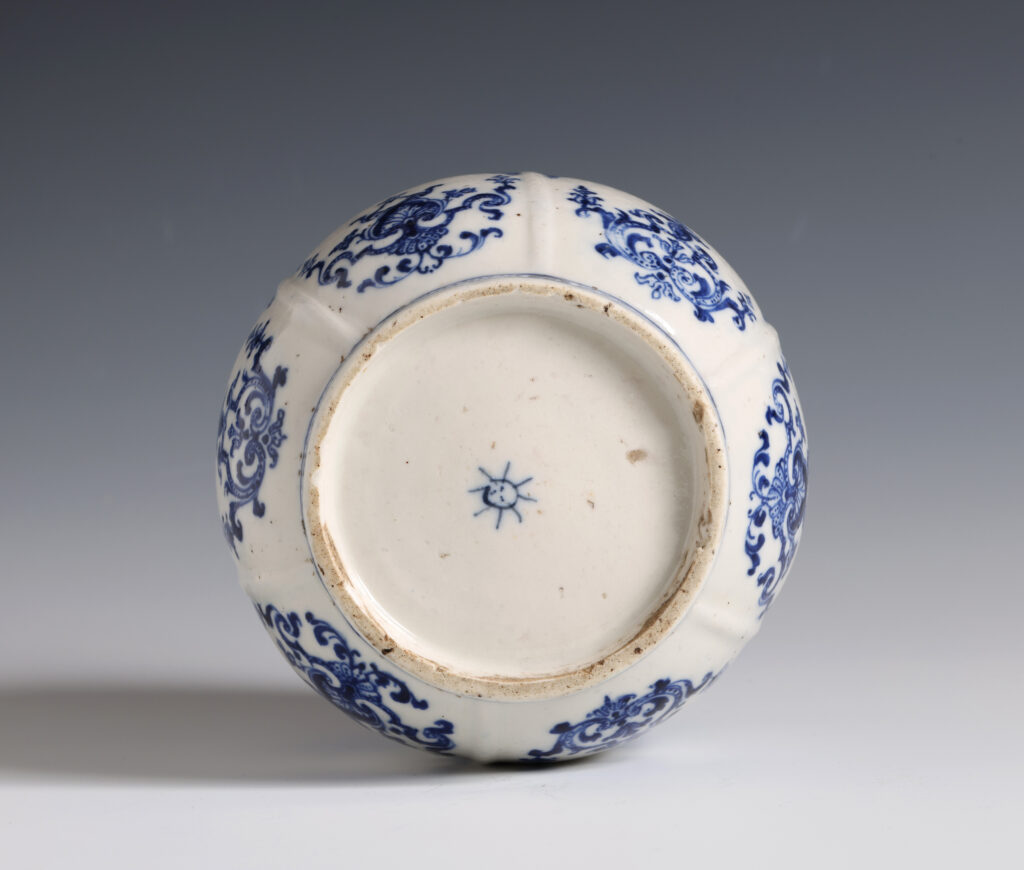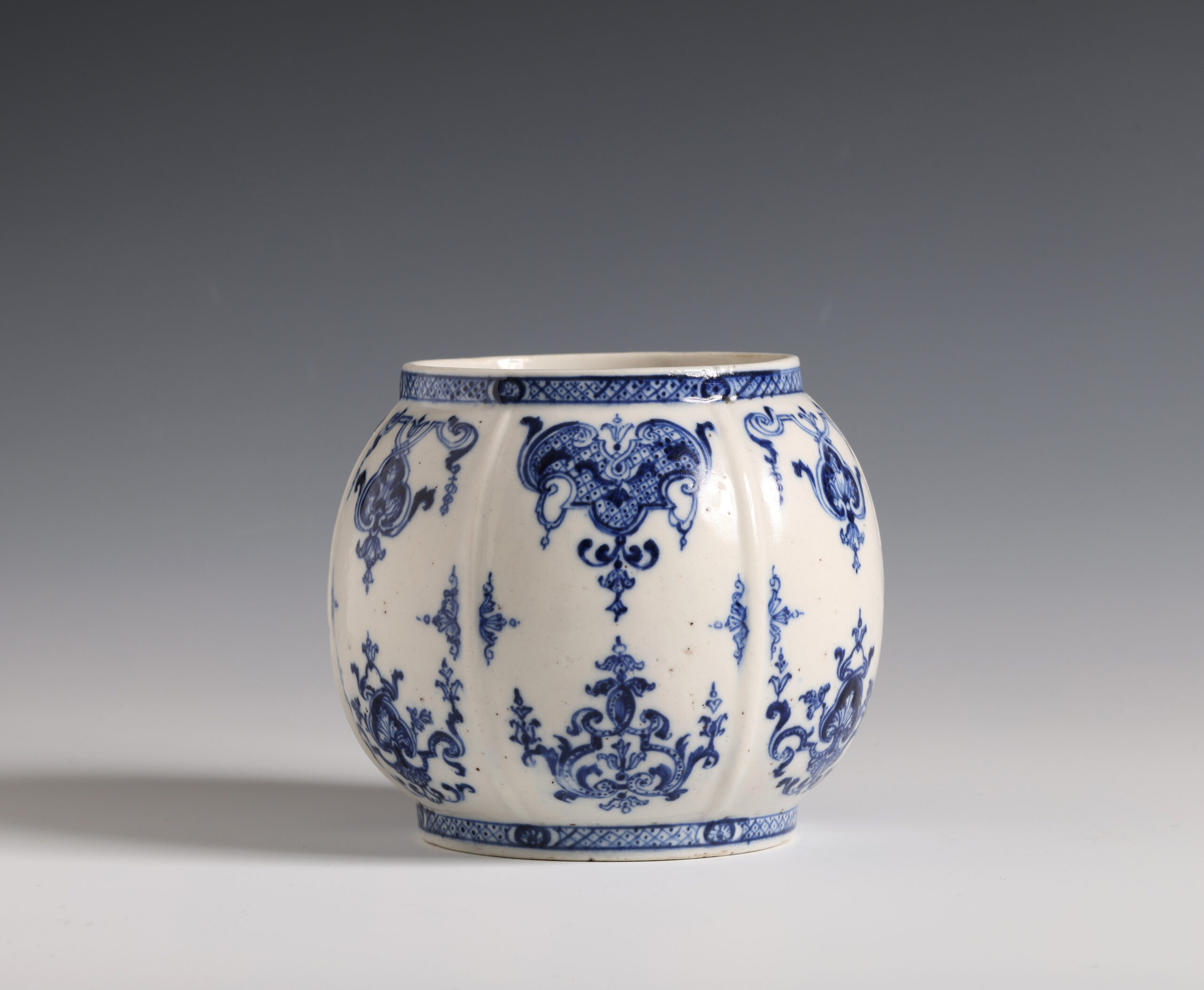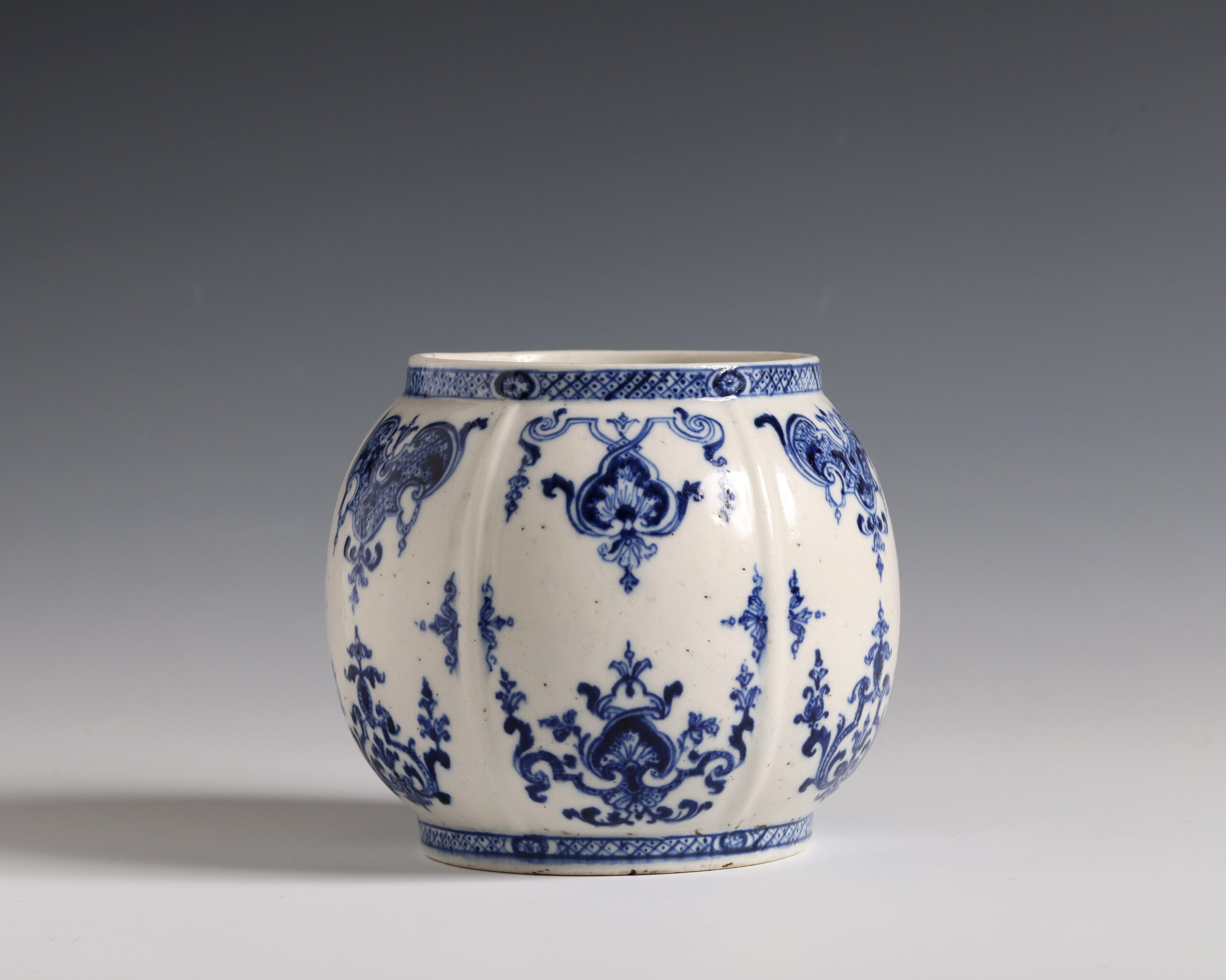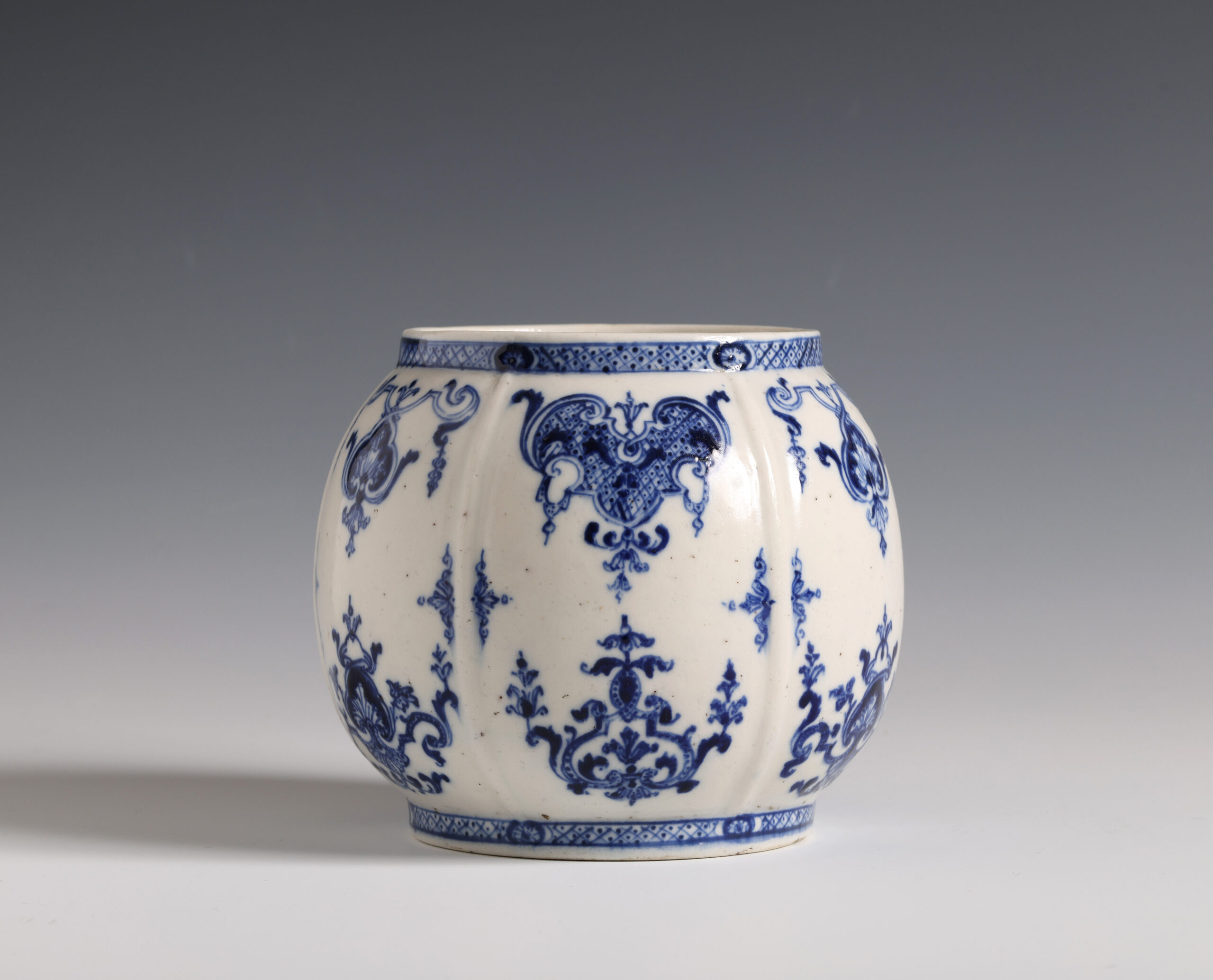 Of globular form with six panels decorated with underglaze blue berainesque lambrequin ornament divided by raised ribs.