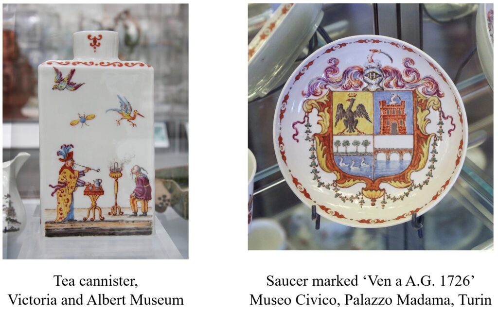 Perhaps only one dated piece of Vezzi porcelain exists, an armorial saucer in the Museo Civico in Turin inscribed ‘Ven a A.G. 1726’. The palette of this can be matched closely to the tea cannister in the Victoria and Albert Museum with chinoiserie decoration after an engraving of Martin Englebrecht which has an iron-red border around the neck rather similar to the border on the inner rim of our cup.[iii]