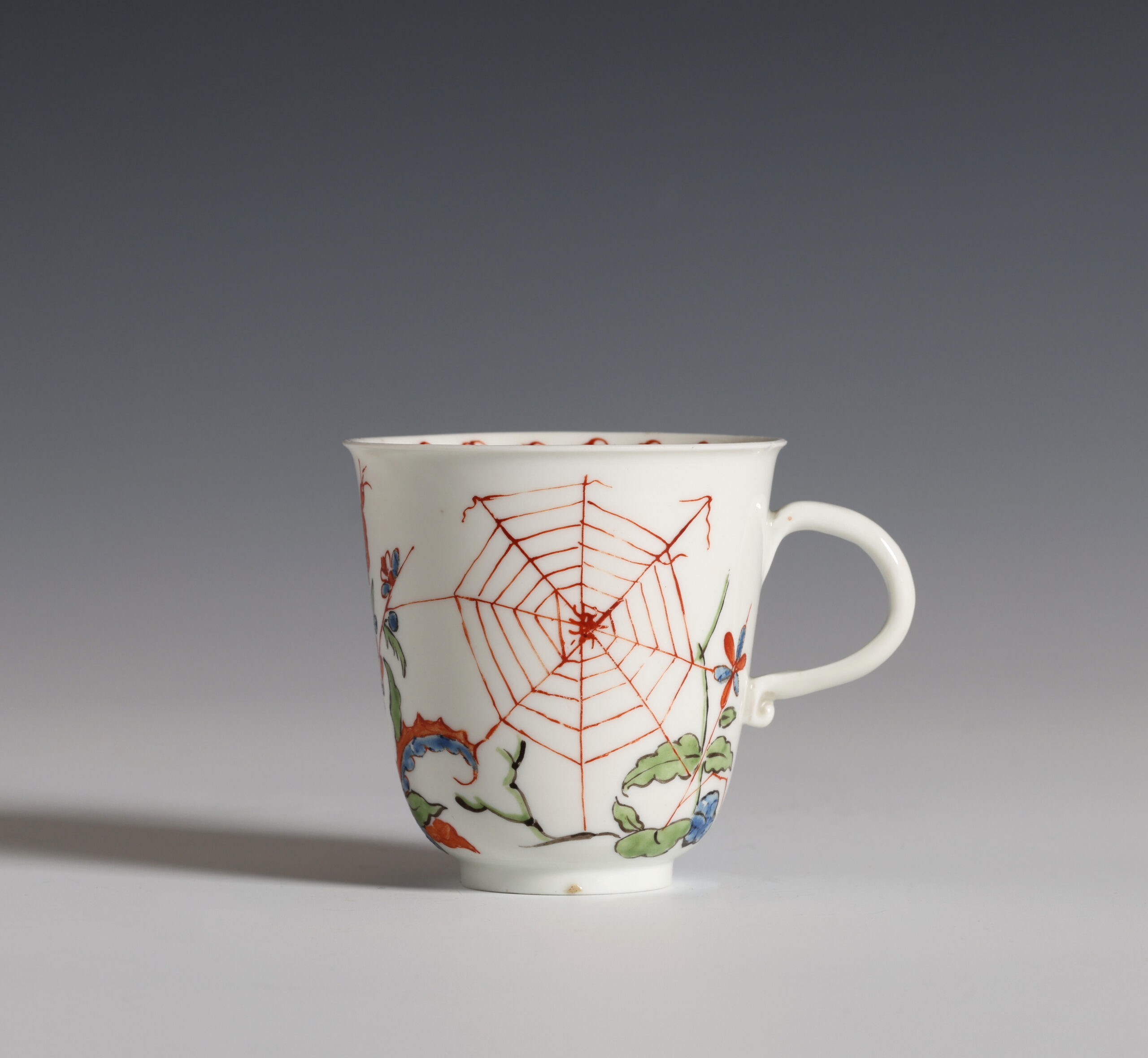 Perhaps only one dated piece of Vezzi porcelain exists, an armorial saucer in the Museo Civico in Turin inscribed ‘Ven a A.G. 1726’. The palette of this can be matched closely to the tea cannister in the Victoria and Albert Museum with chinoiserie decoration after an engraving of Martin Englebrecht which has an iron-red border around the neck rather similar to the border on the inner rim of our cup.[iii]