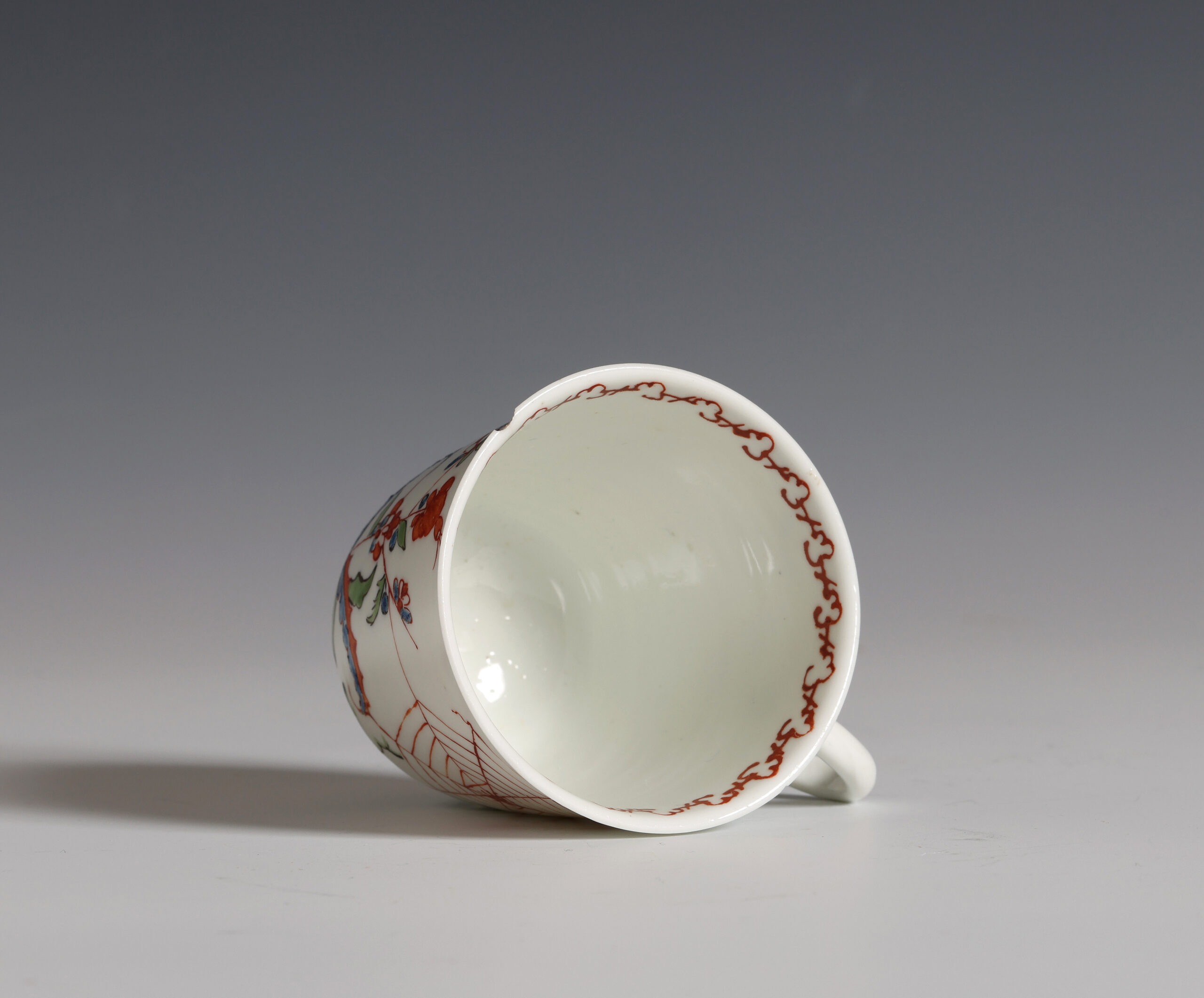 There are several reasons for thinking that the decoration of our cup is relatively early. Similar serrated leaves can be found on examples of Vezzi porcelain decorated in underglaze blue which can only be done before the firing of the porcelain which stopped by 1727. Such leaves can be seen on a pair of underglaze blue and gold decorated covered vases published in Brittle Beauty.[ii]