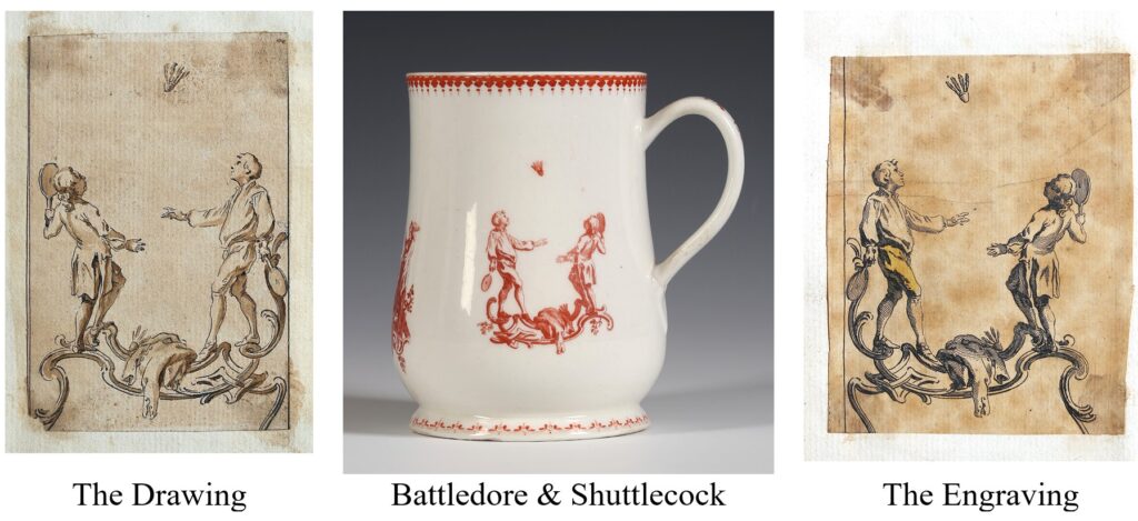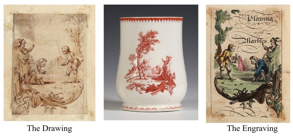 The original drawings and engravings of two of the three scenes on this tankard appear in an album of thirty pen and ink drawings by Gravelot and 70 etchings by James Cole of around 1740-45 bound together in an album which we recently sold to the Victoria and Albert Museum.[ii] The third scene, the Whip-Top, also after Gravelot is known from a later engraving from after his return to Paris.[iii]