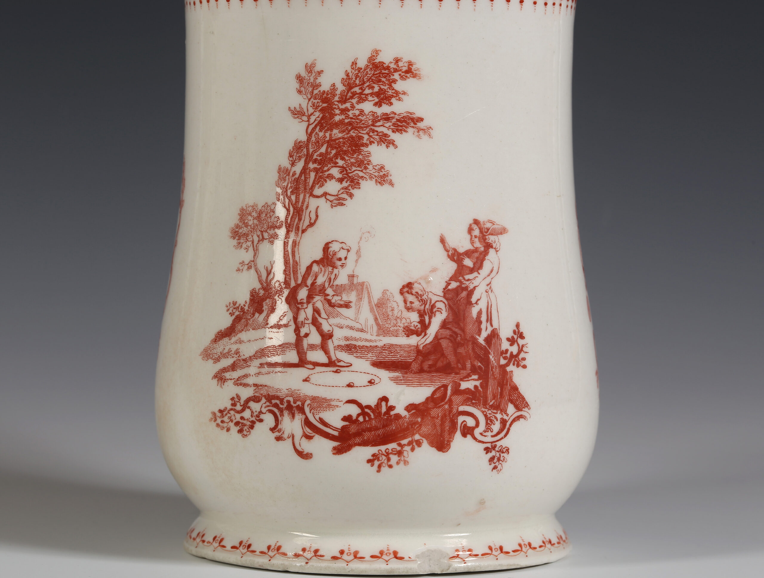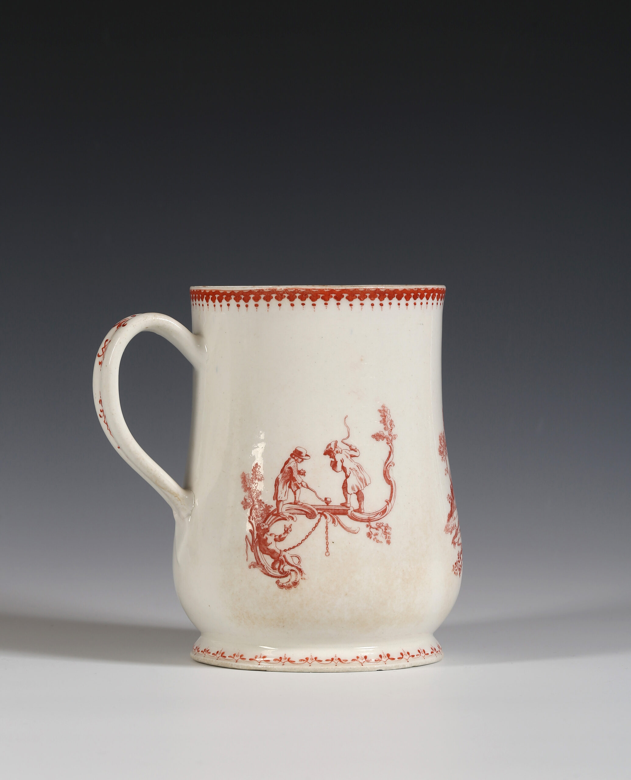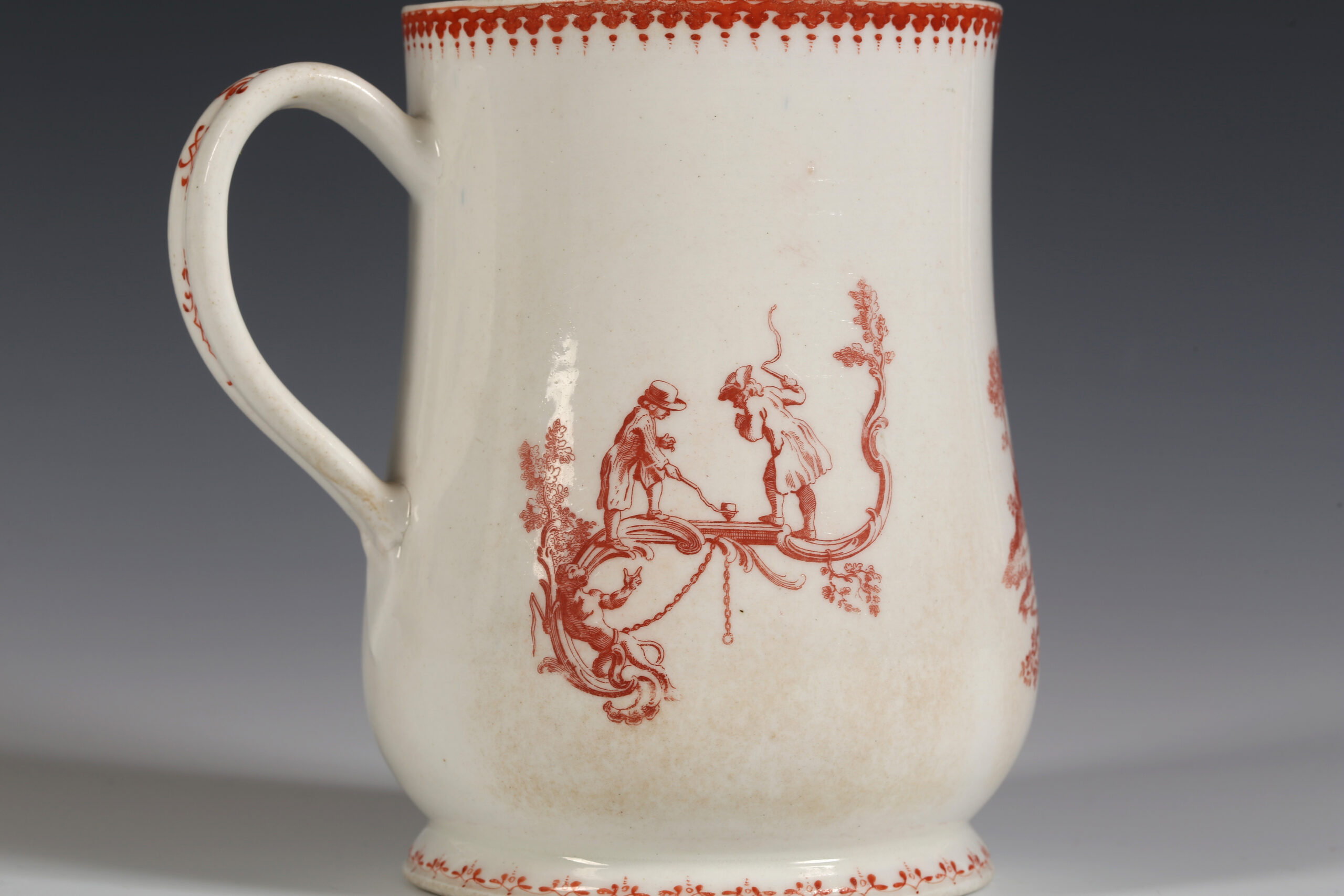 The baluster tankard is printed in iron-red with three scenes after drawings by Hubert-François Gravelot, the French artist who came to England from Paris in 1732, and almost more than anyone else, is credited with introducing the Rococo to England. He left behind a wealth of designs when he returned to Paris in 1746. He had his own drawing school as well as being involved with the St Martins Lane Academy.[i]