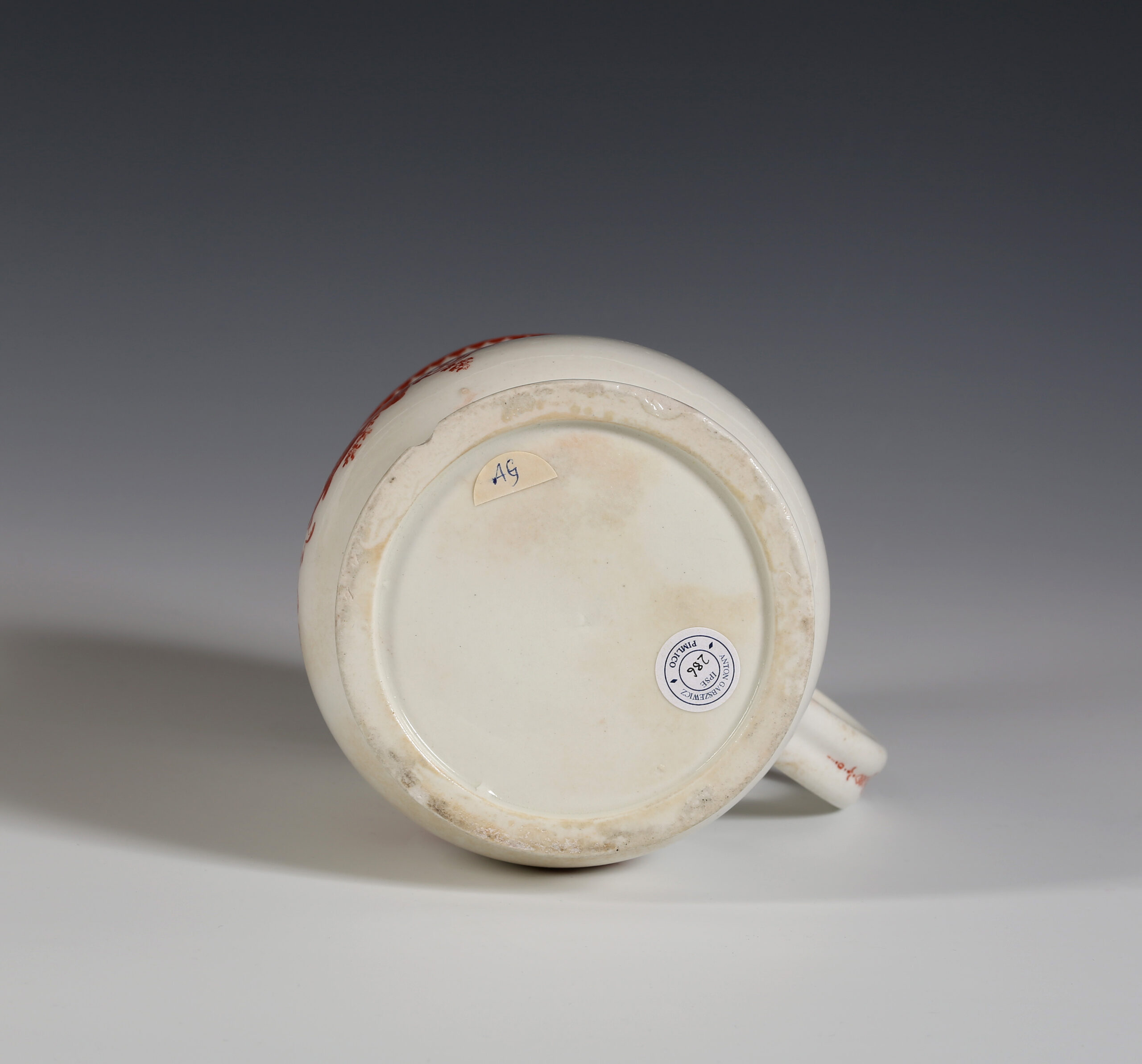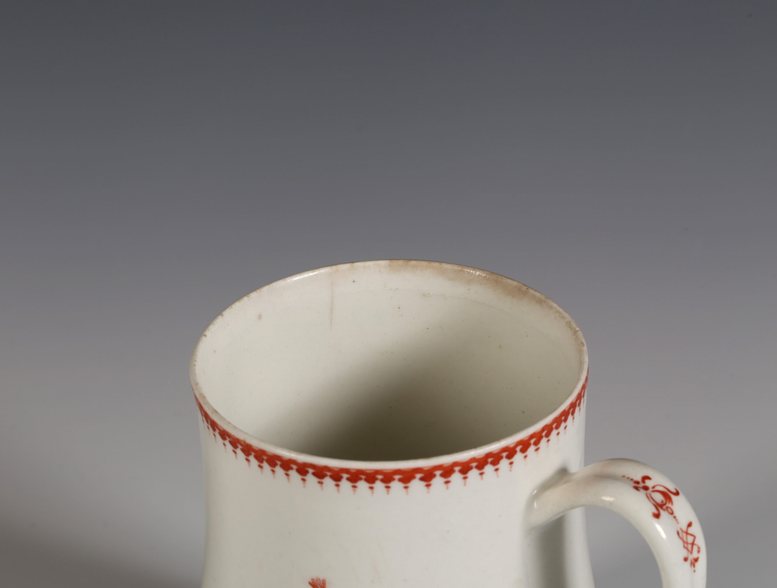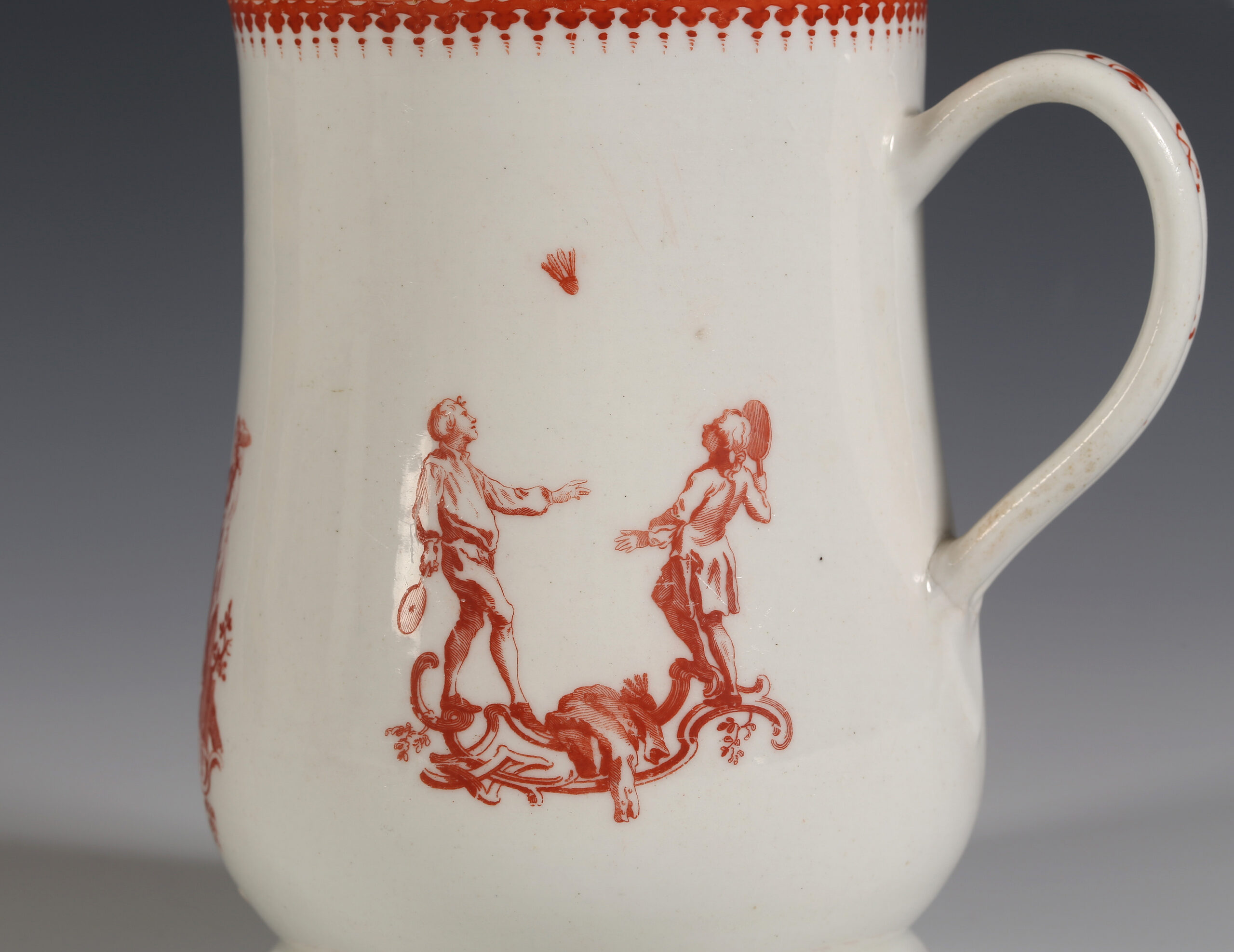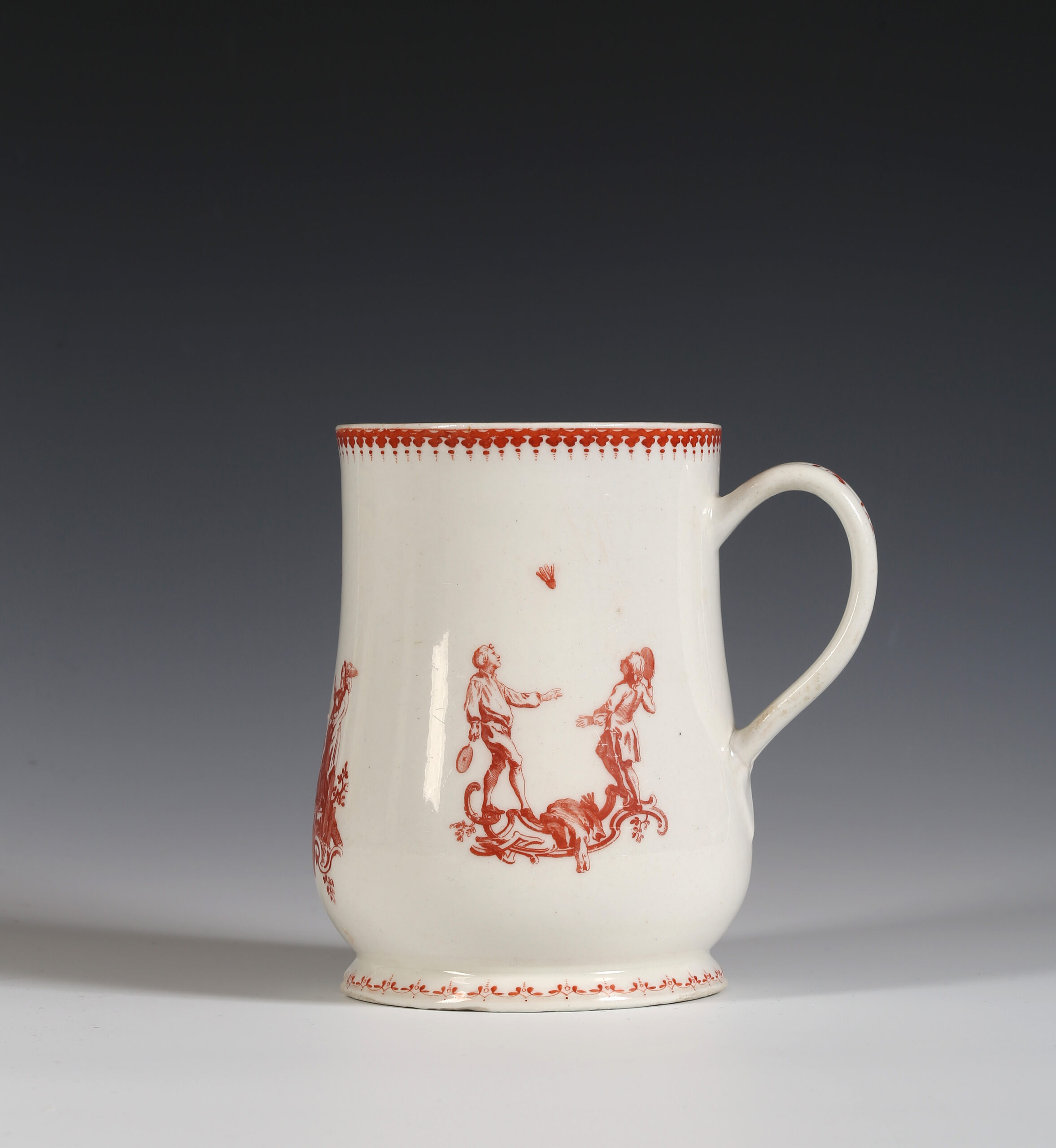 The baluster tankard is printed in iron-red with three scenes after drawings by Hubert-François Gravelot, the French artist who came to England from Paris in 1732, and almost more than anyone else, is credited with introducing the Rococo to England. He left behind a wealth of designs when he returned to Paris in 1746. He had his own drawing school as well as being involved with the St Martins Lane Academy.[i]