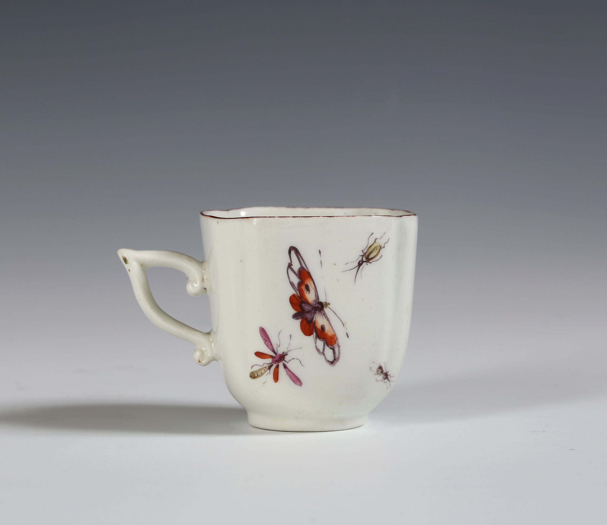 Cups of quatrefoil section with indented corners and wishbone handles were a speciality of Derby at a time when they were more focussed of sculptural work. They are rarely seen with saucers but one at least does survive.[i]