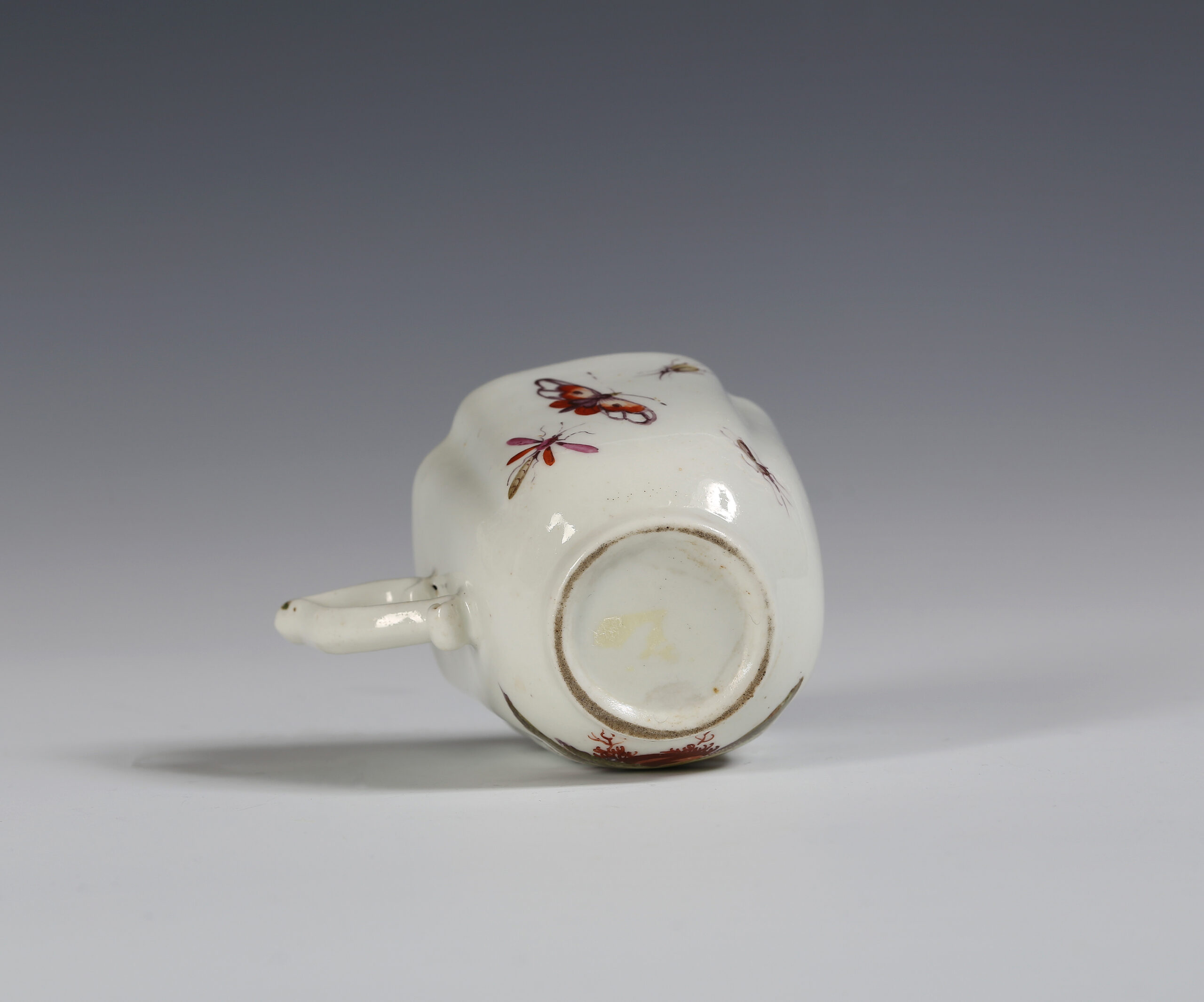 Sir Bruno Welby thought that this, and another similar cup in his collection was painted by the ‘Cotton stem painter’ who is mostly associated with his distinctive style of painting bouquets of flowers.
