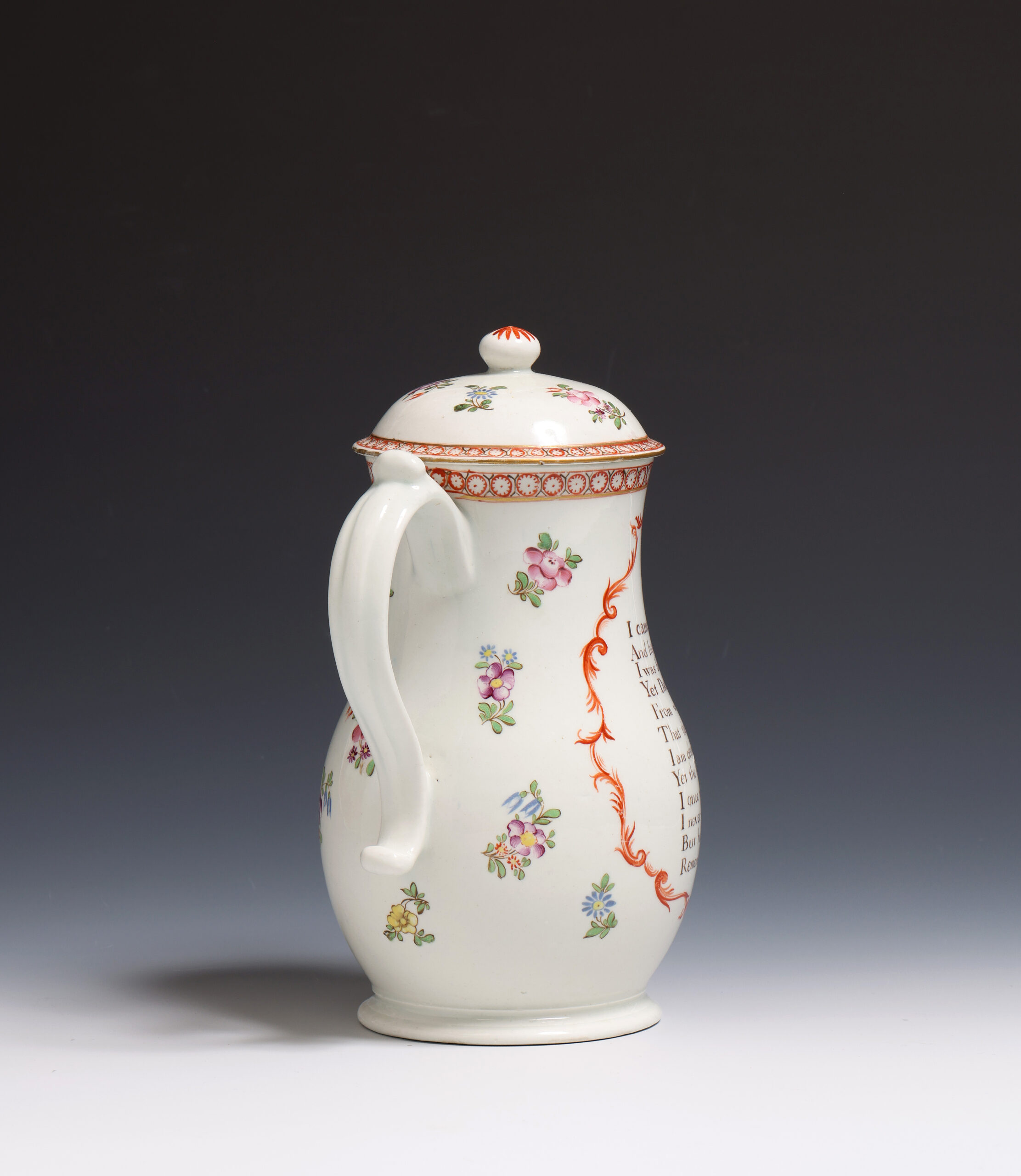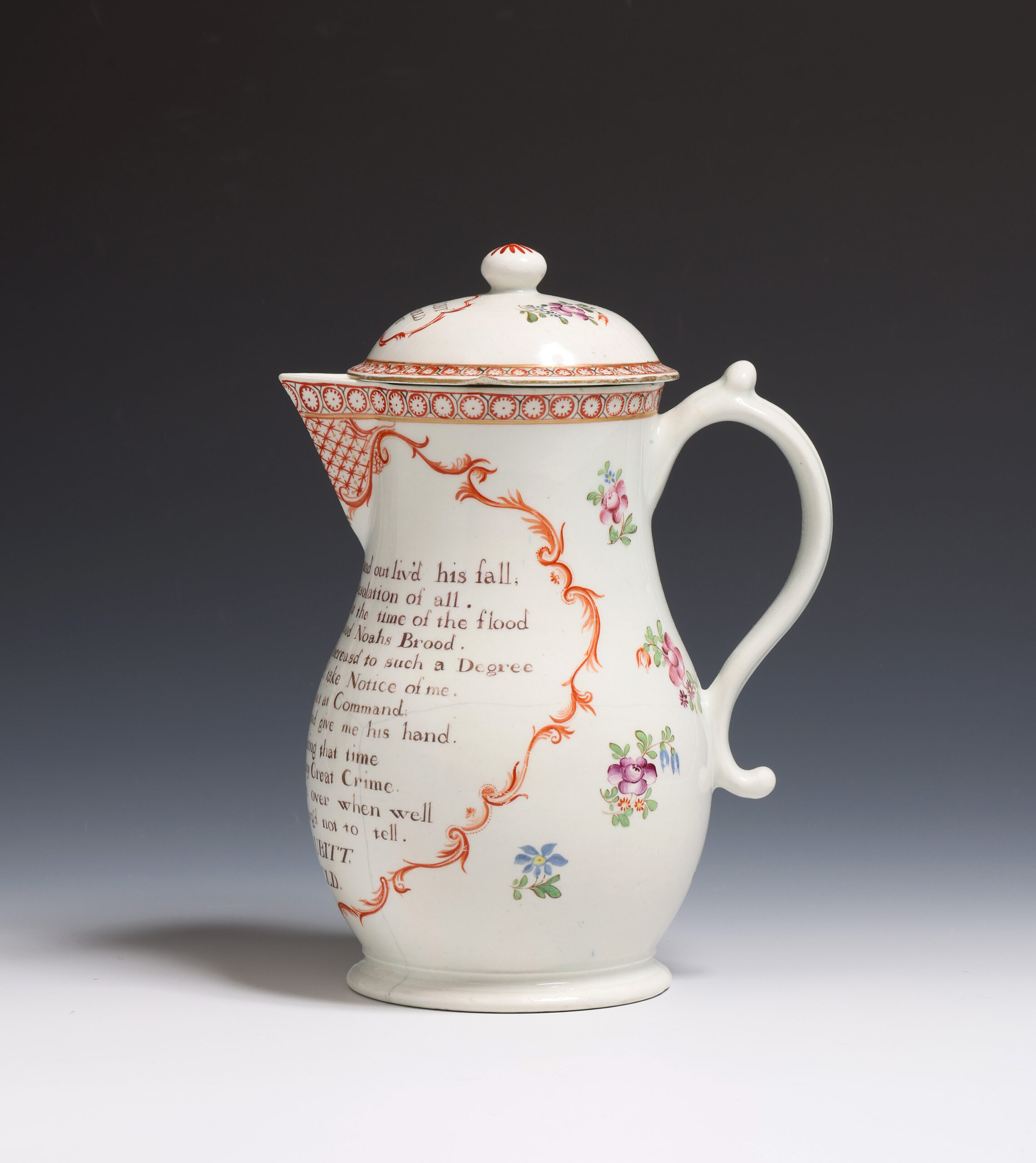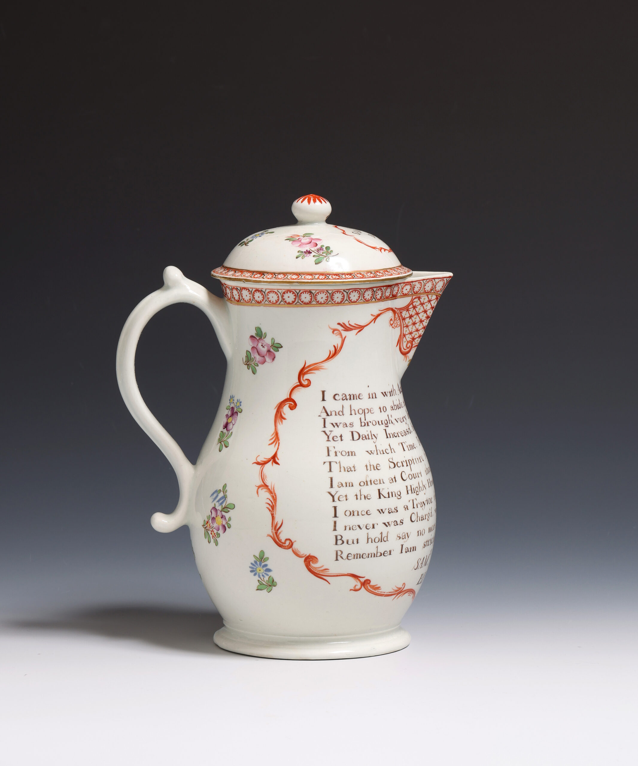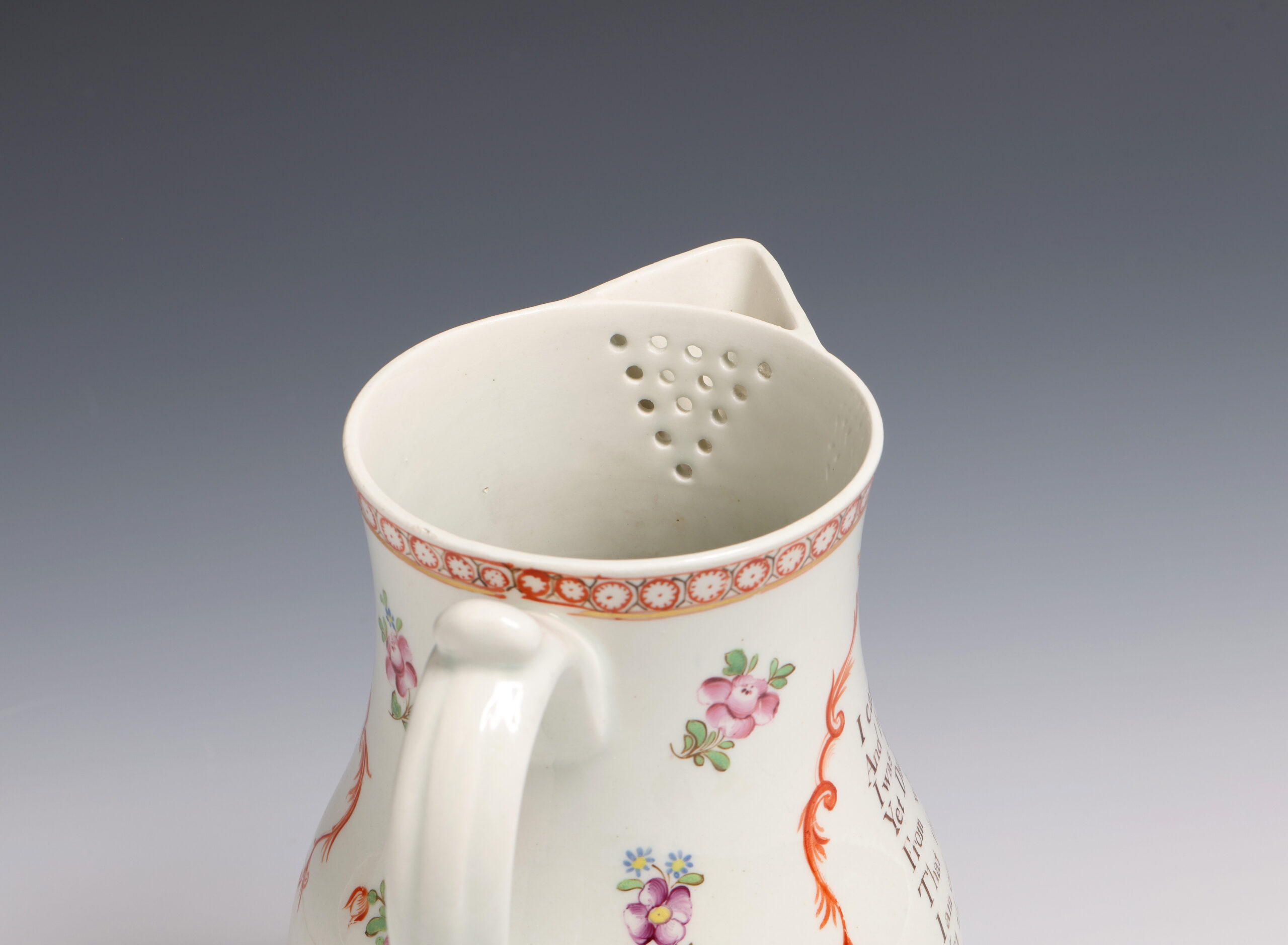 Geoffrey Godden in his An Illustrated Guide to Lowestoft Porcelain (1969), discusses the various types of jugs made at Lowestoft, pointing out that they are something of a speciality of the factory. This jug is hand thrown rather than moulded and has a pierced straining wall in spout. Godden argues that these were likely to be for punch.[ii] Godden illustrates another jug with an inscription by the same hand which he tentatively associates with the ‘Tulip Painter’.[iii] He records our jug in his list of dated examples but mistakenly says that it is painted in underglaze-blue.[iv]