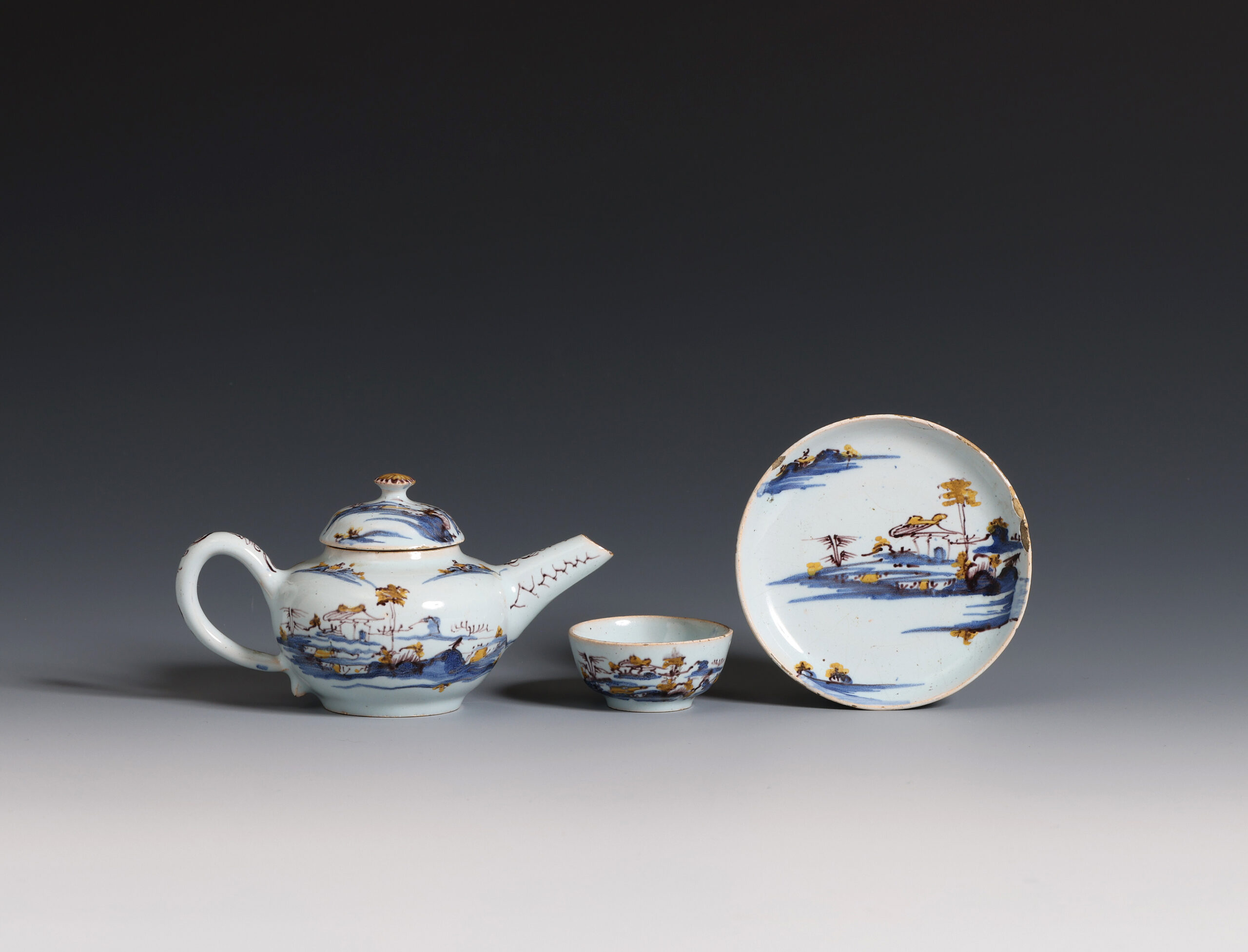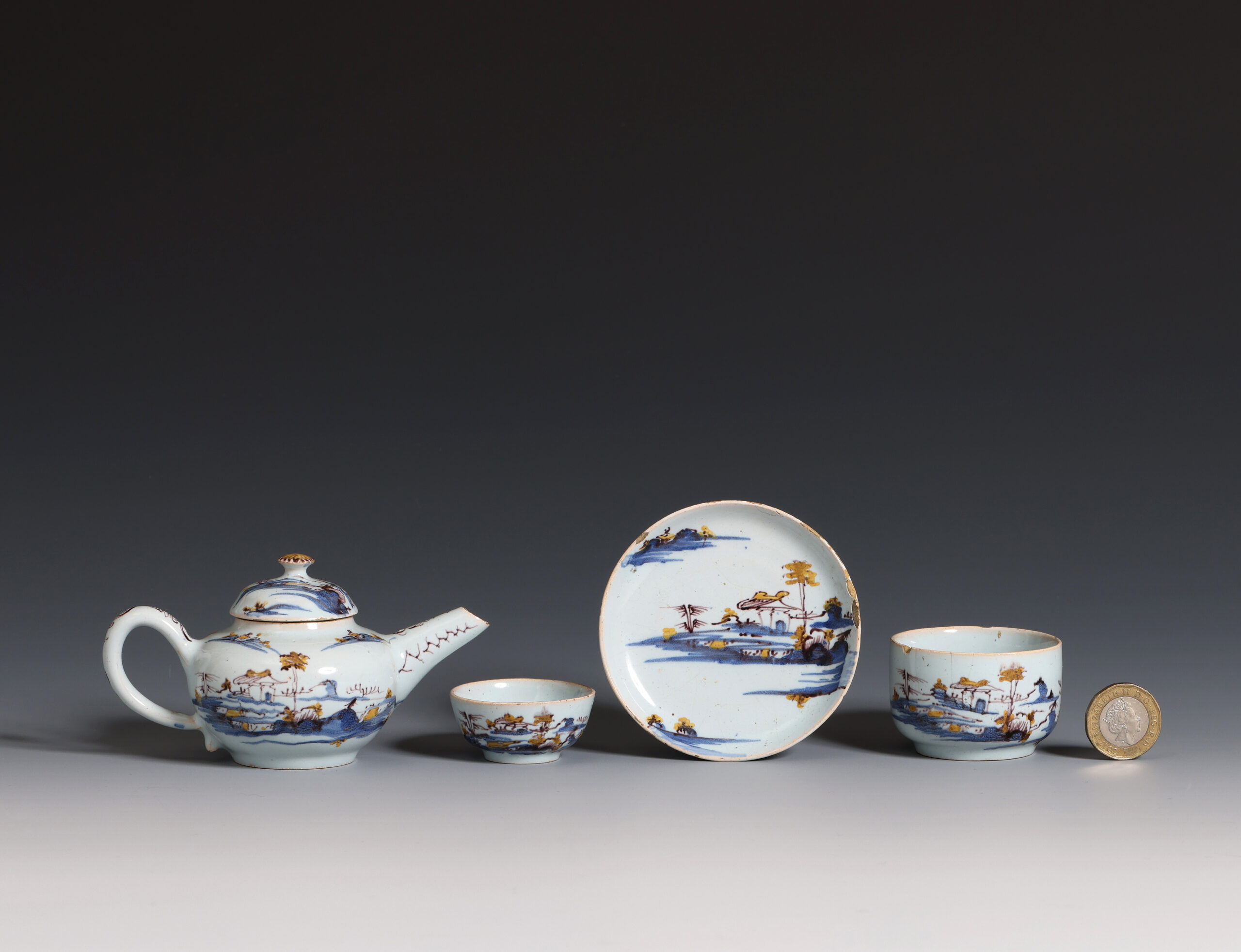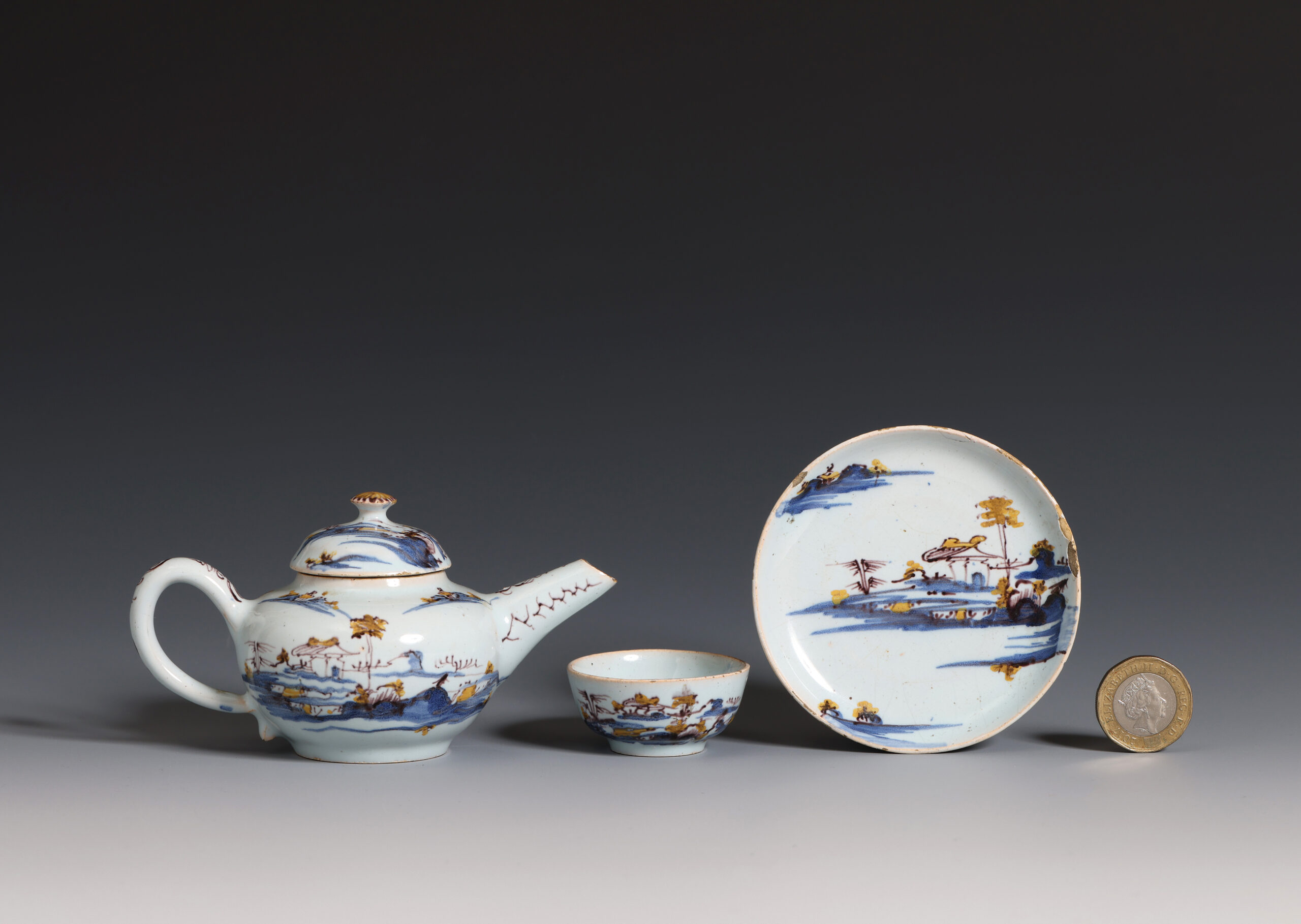 This is a rare and finely potted survival of part of a polychrome child’s tea service in English delftware. It comprises a teapot and cover, a teabowl and saucer, a sugar bowl and three further teabowls.