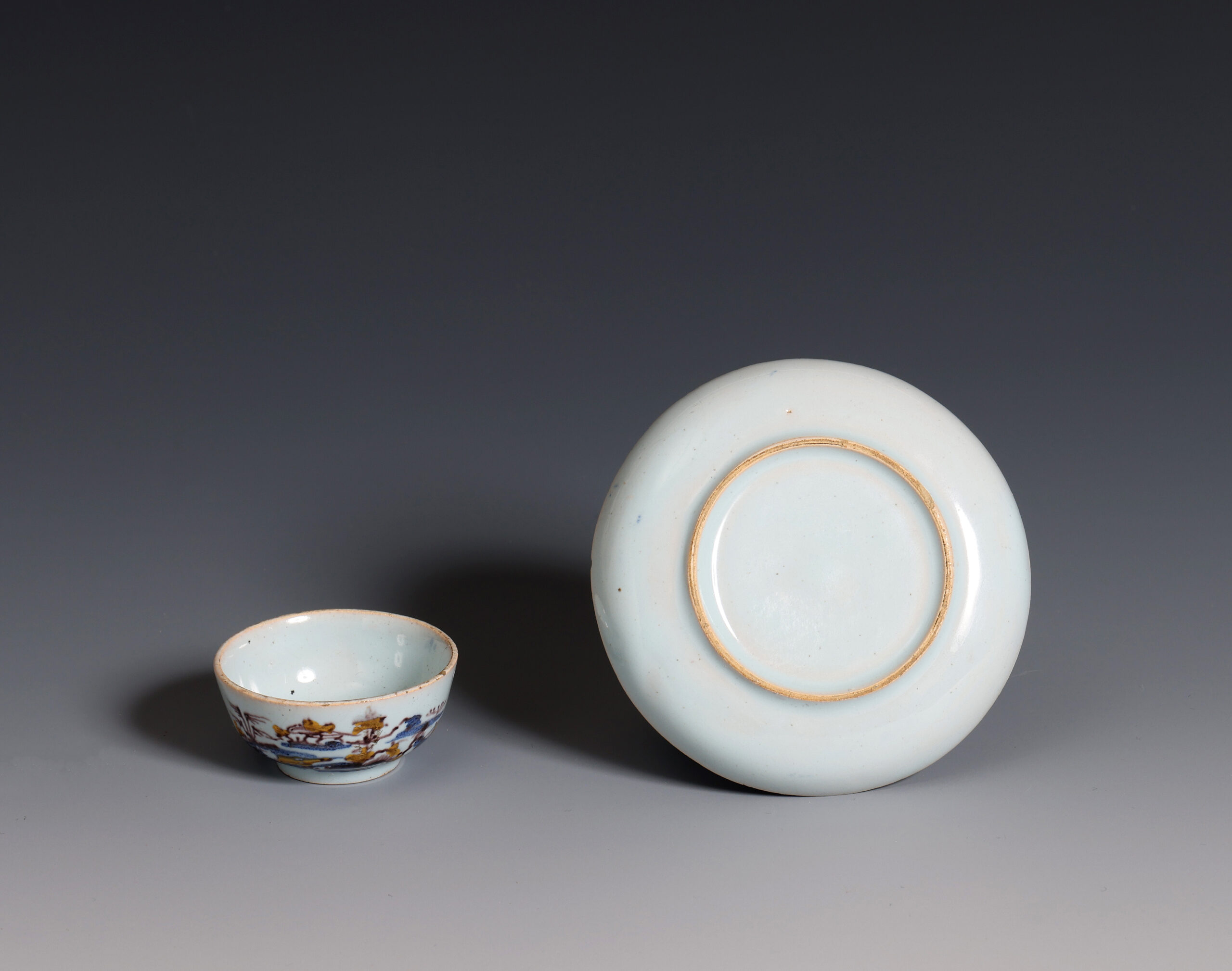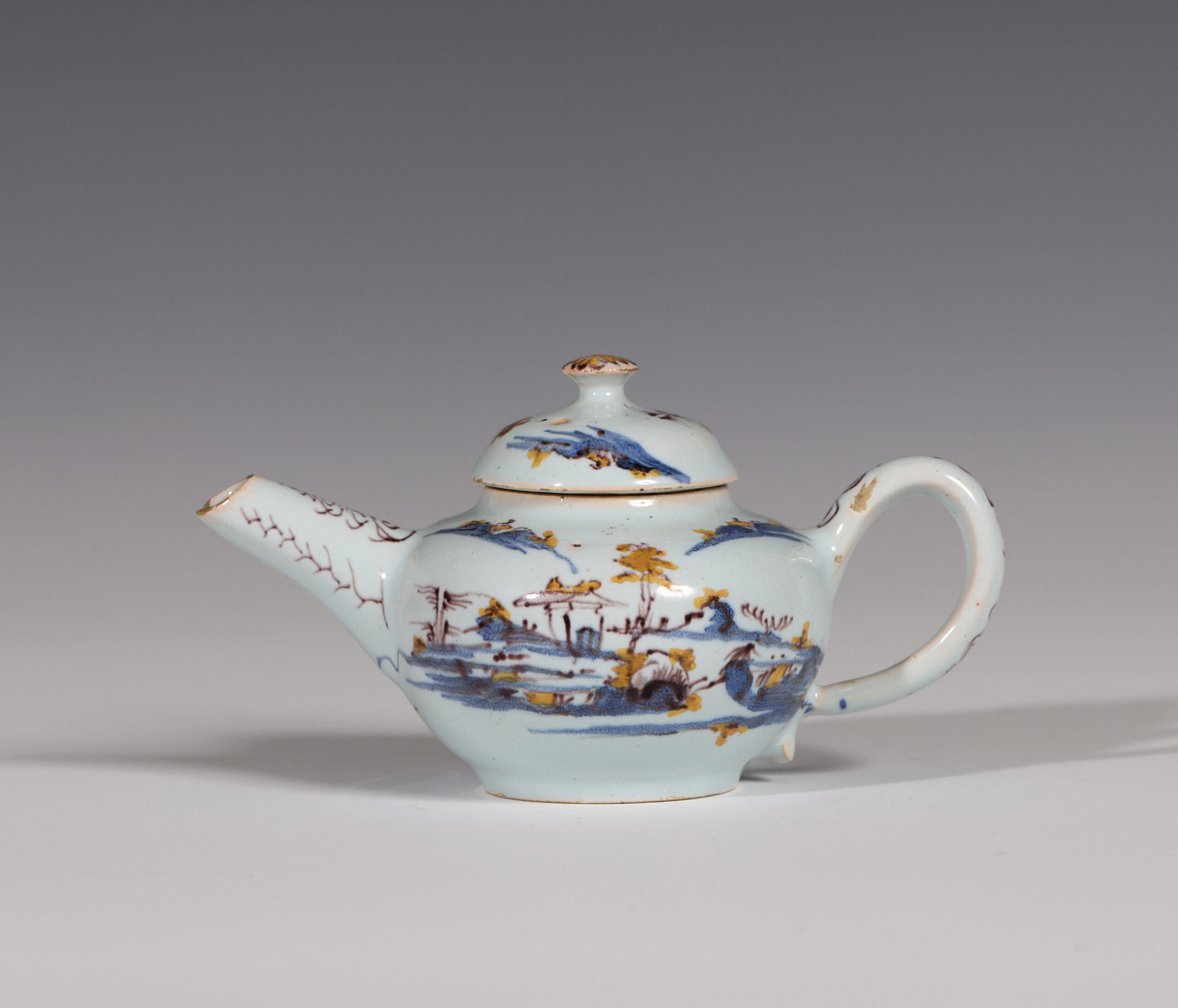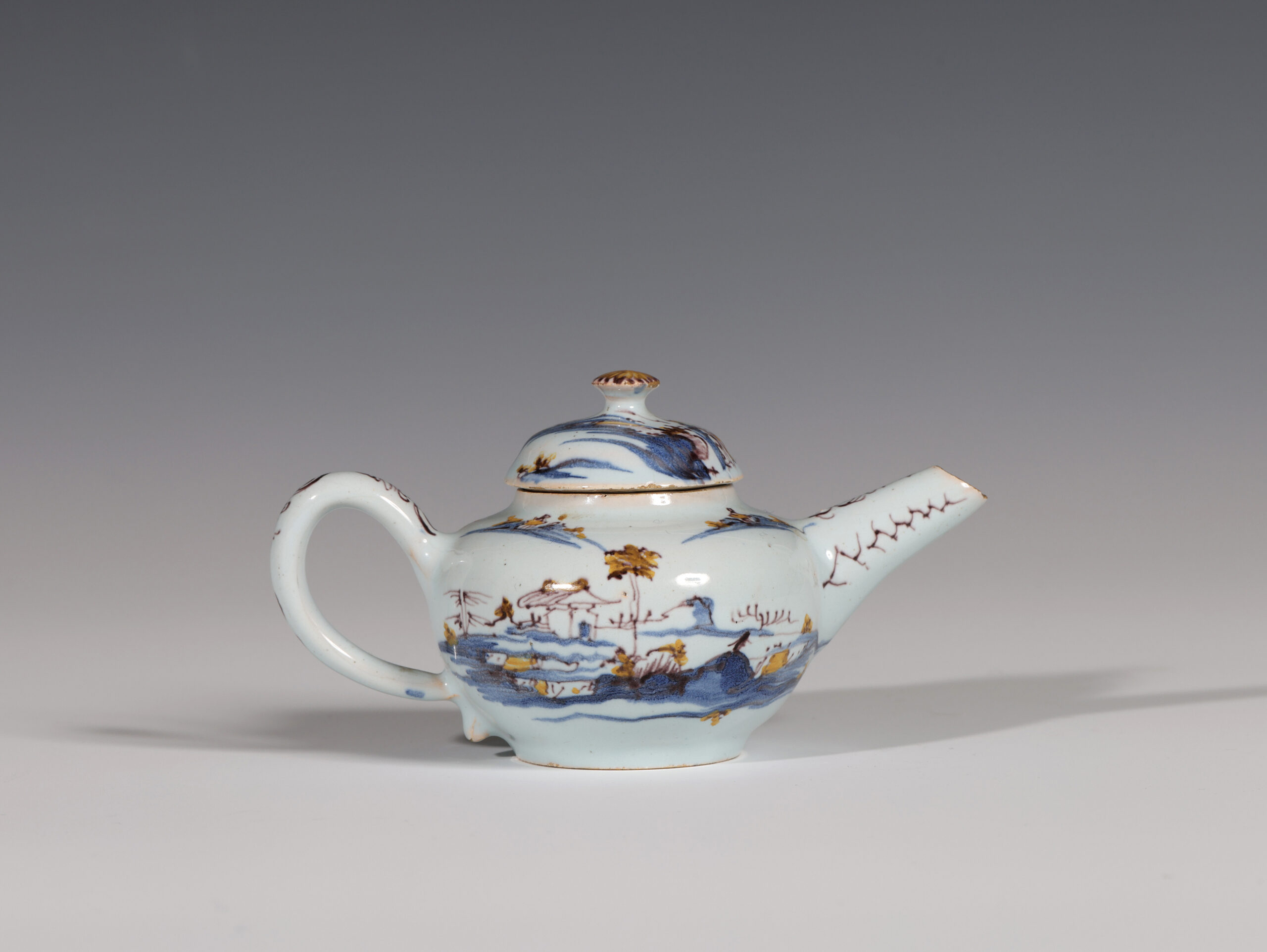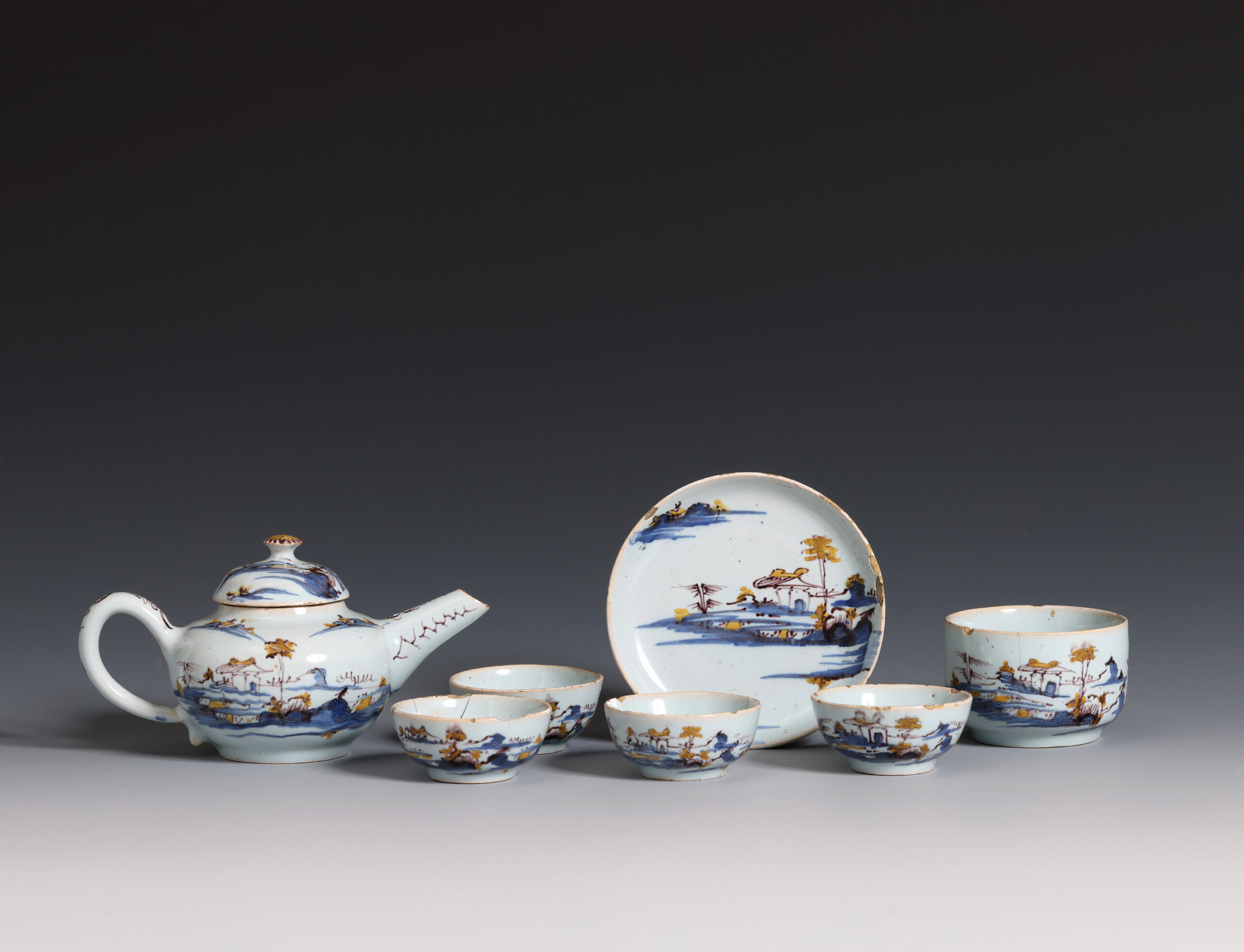 This is a rare and finely potted survival of part of a polychrome child’s tea service in English delftware. It comprises a teapot and cover, a teabowl and saucer, a sugar bowl and three further teabowls.