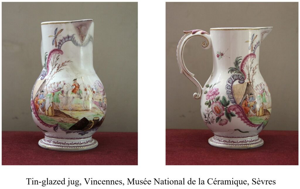 A small number of pieces with an opaque white tin glaze were made at Vincennes in the experimental period of the late 1740s, most famously the jug with a scene of a military encampment in the Musée National de la Céramique, Sèvres.[i]