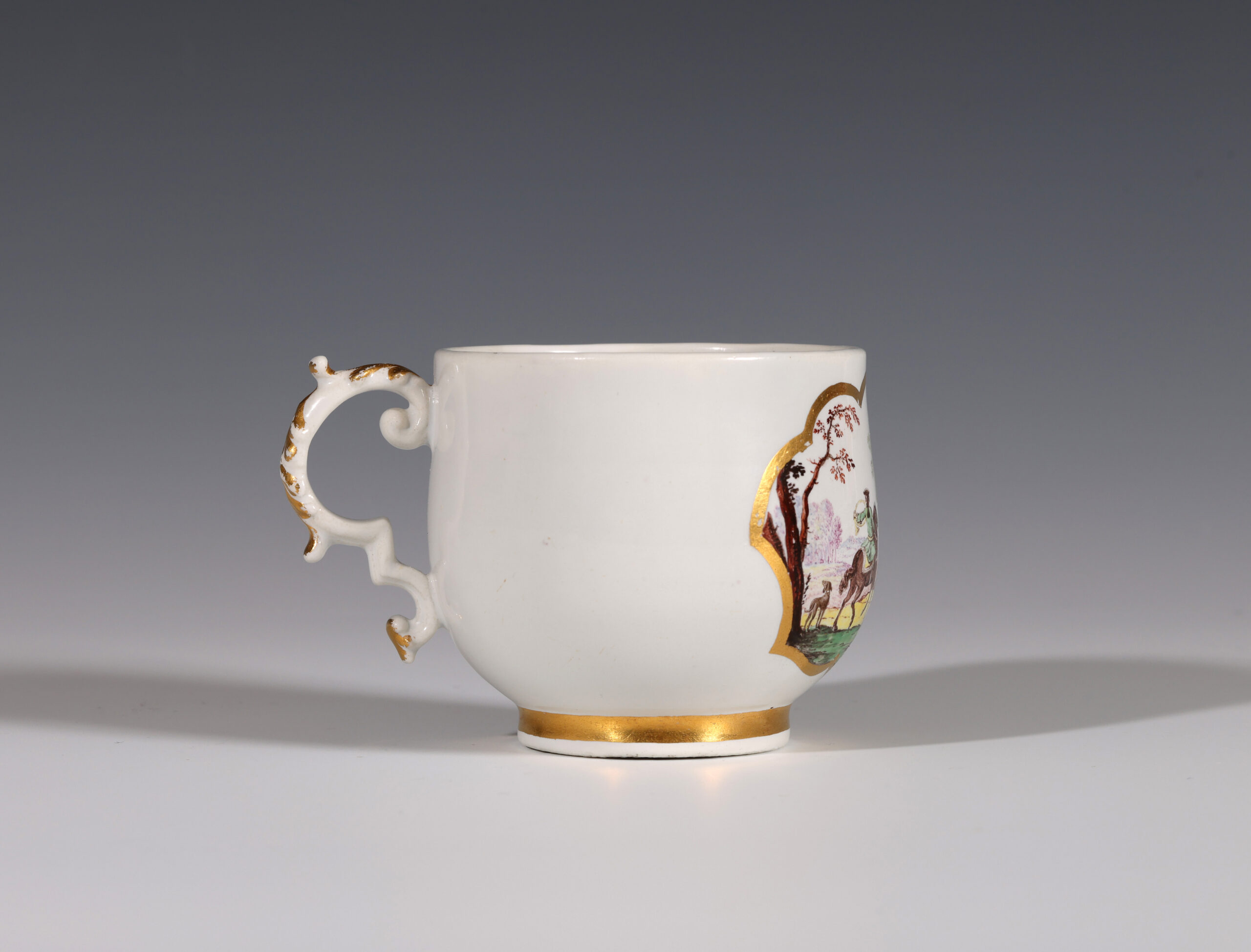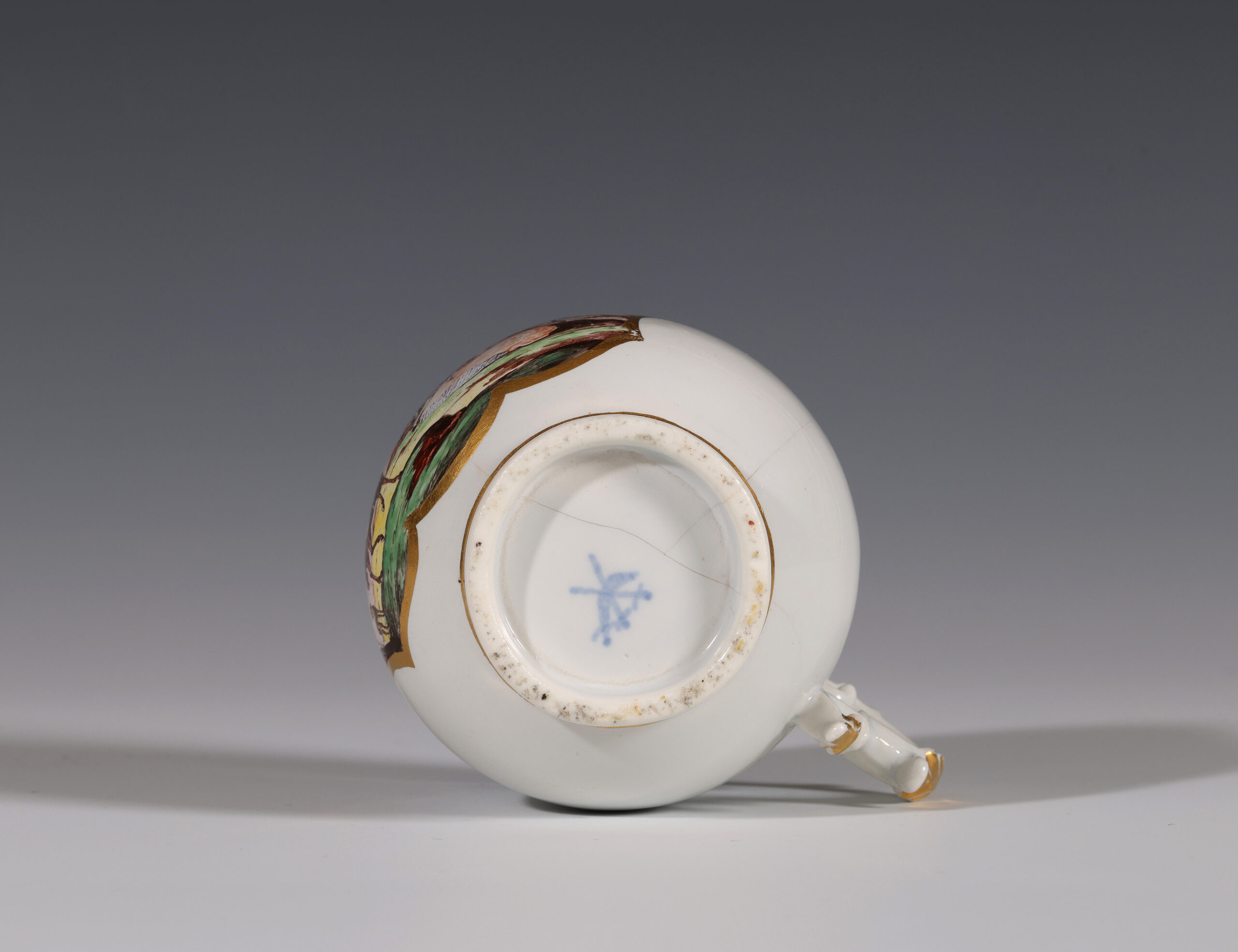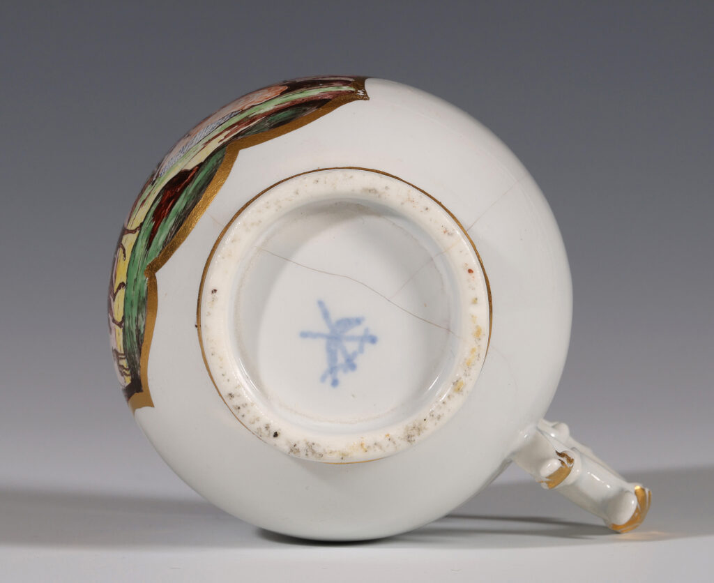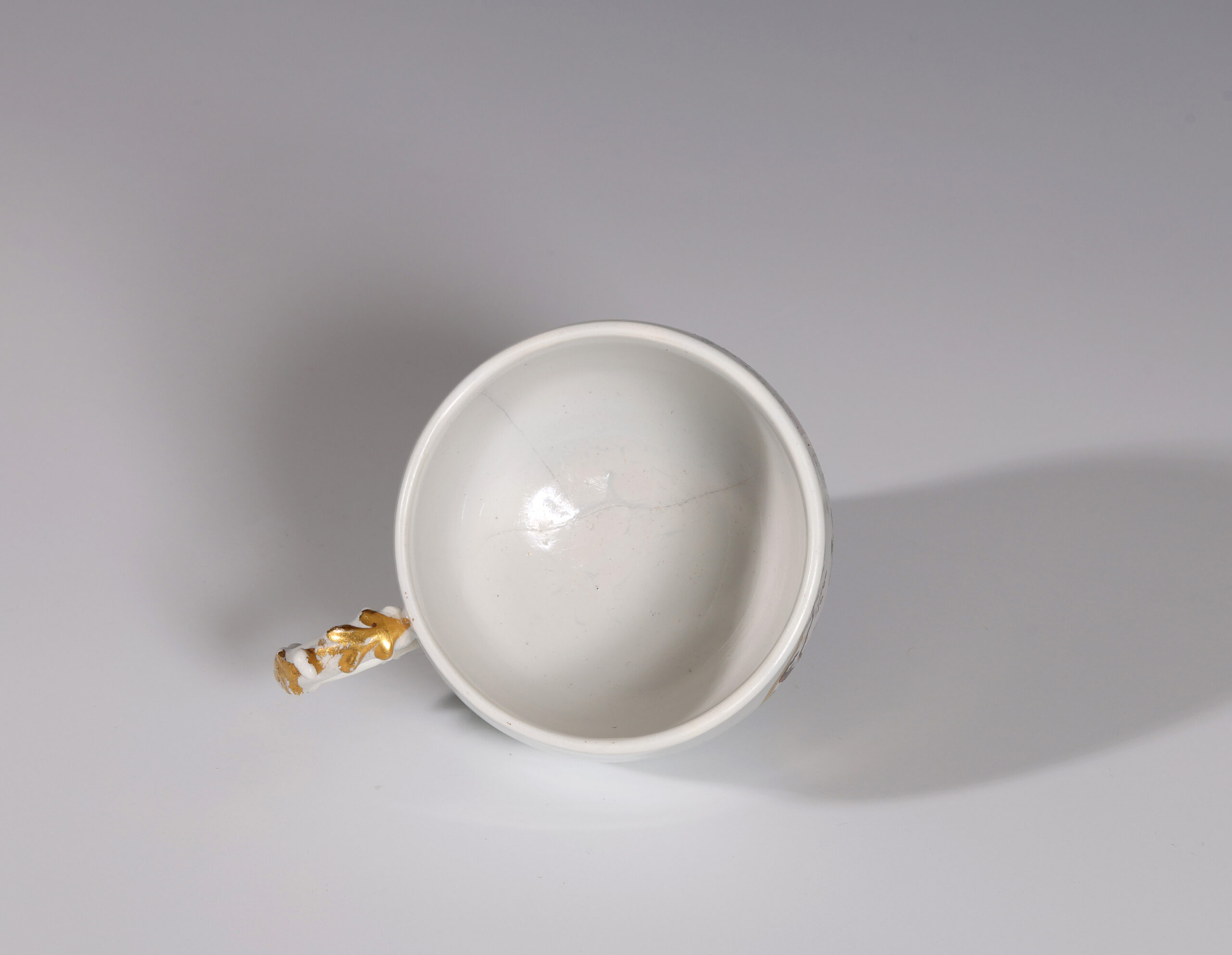 The form of our cup is not recorded at Vincennes, but the shape of the body and the handle are found at Meissen.[ii] Similar Meissen handles were copied at Vincennes.[iii]