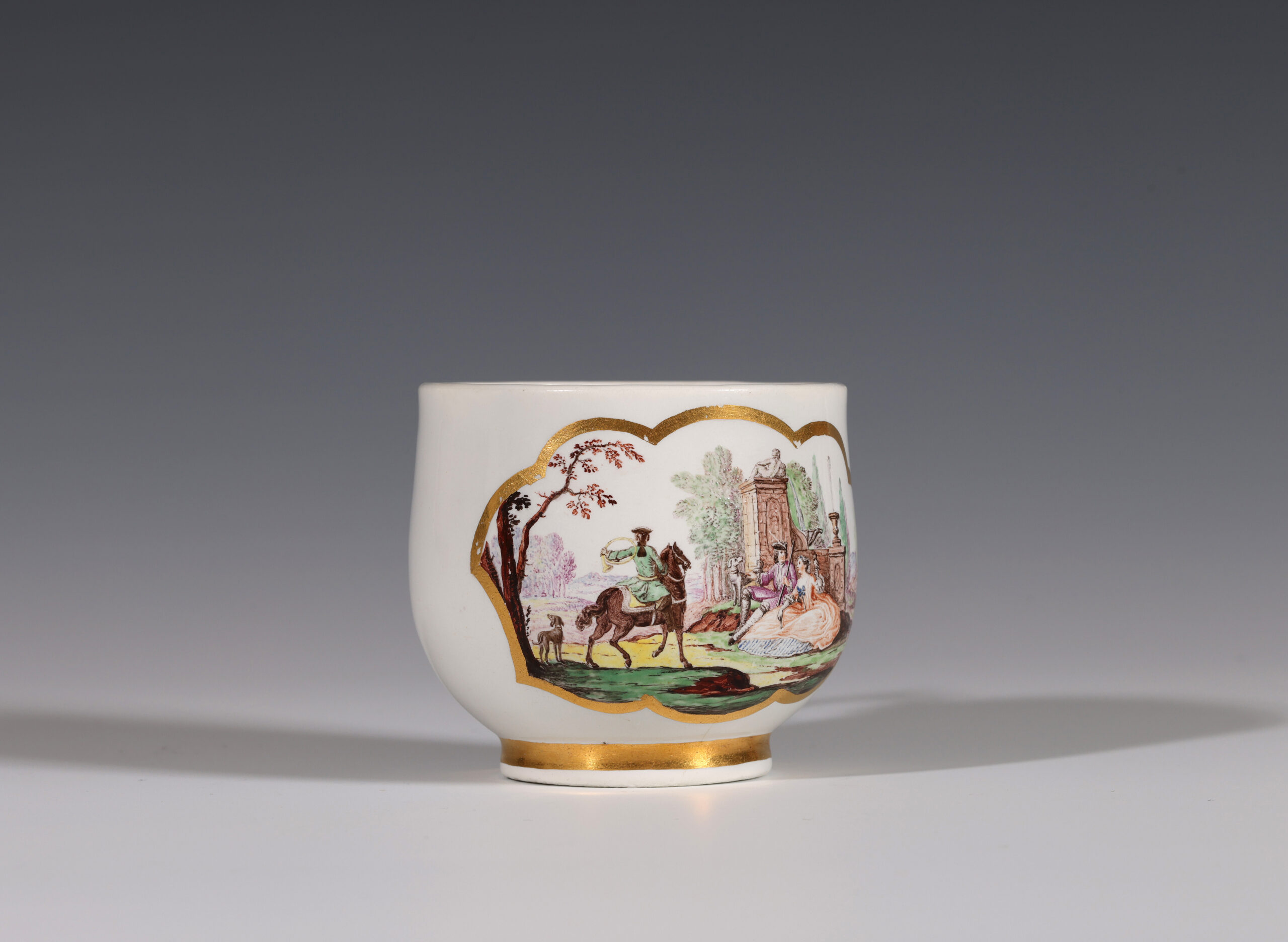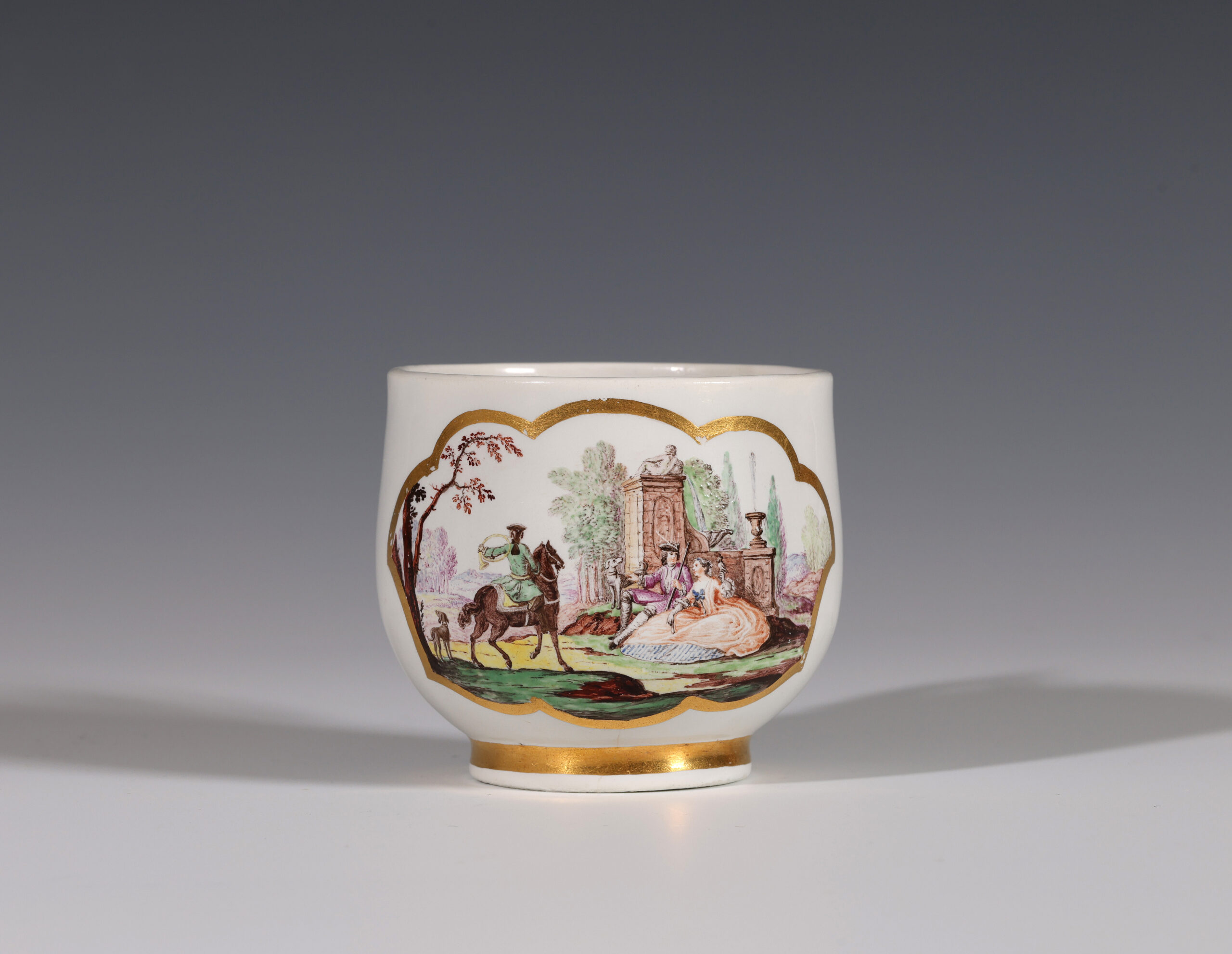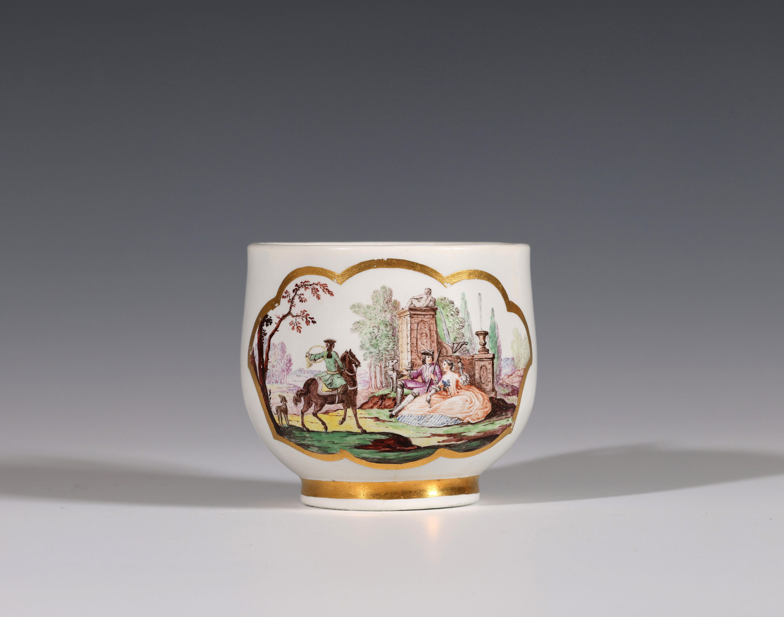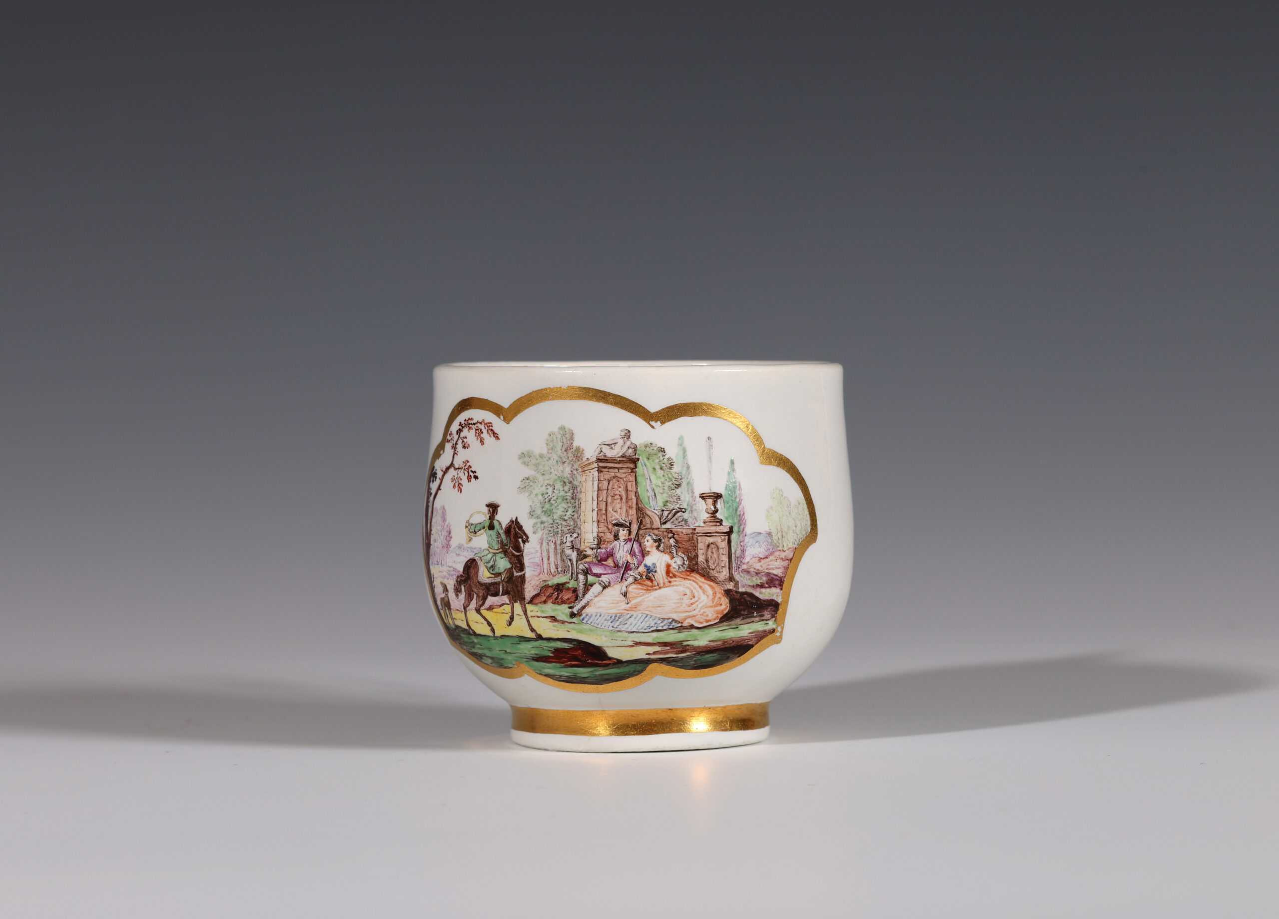 The same hand that painted our cup is found on other pieces from the late 1740s at Vincennes. The painter often portrayed a lady with a striped underskirt and displayed classical sculptures on plinths in romanticised landscapes with slender cypress trees in the background.