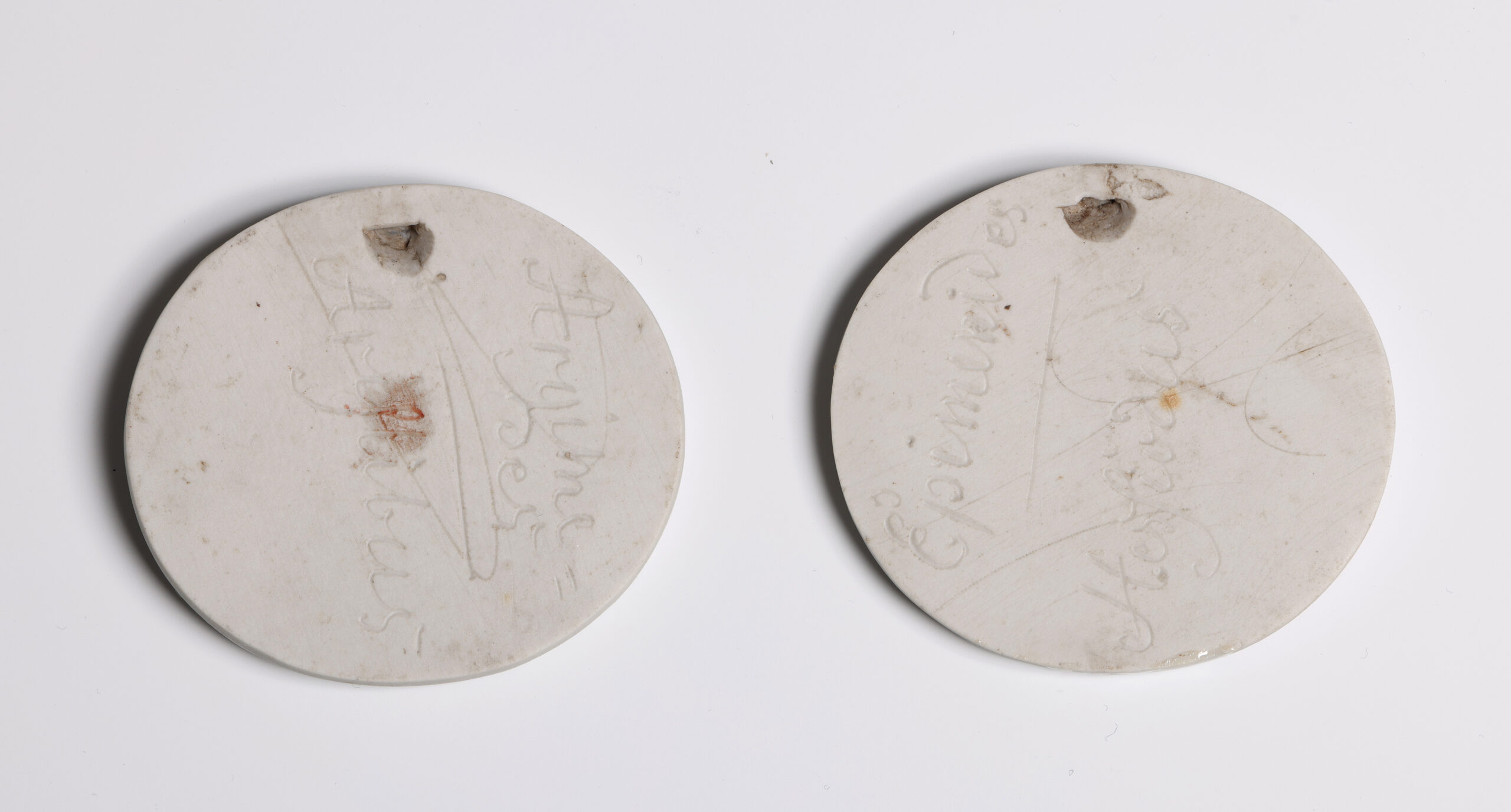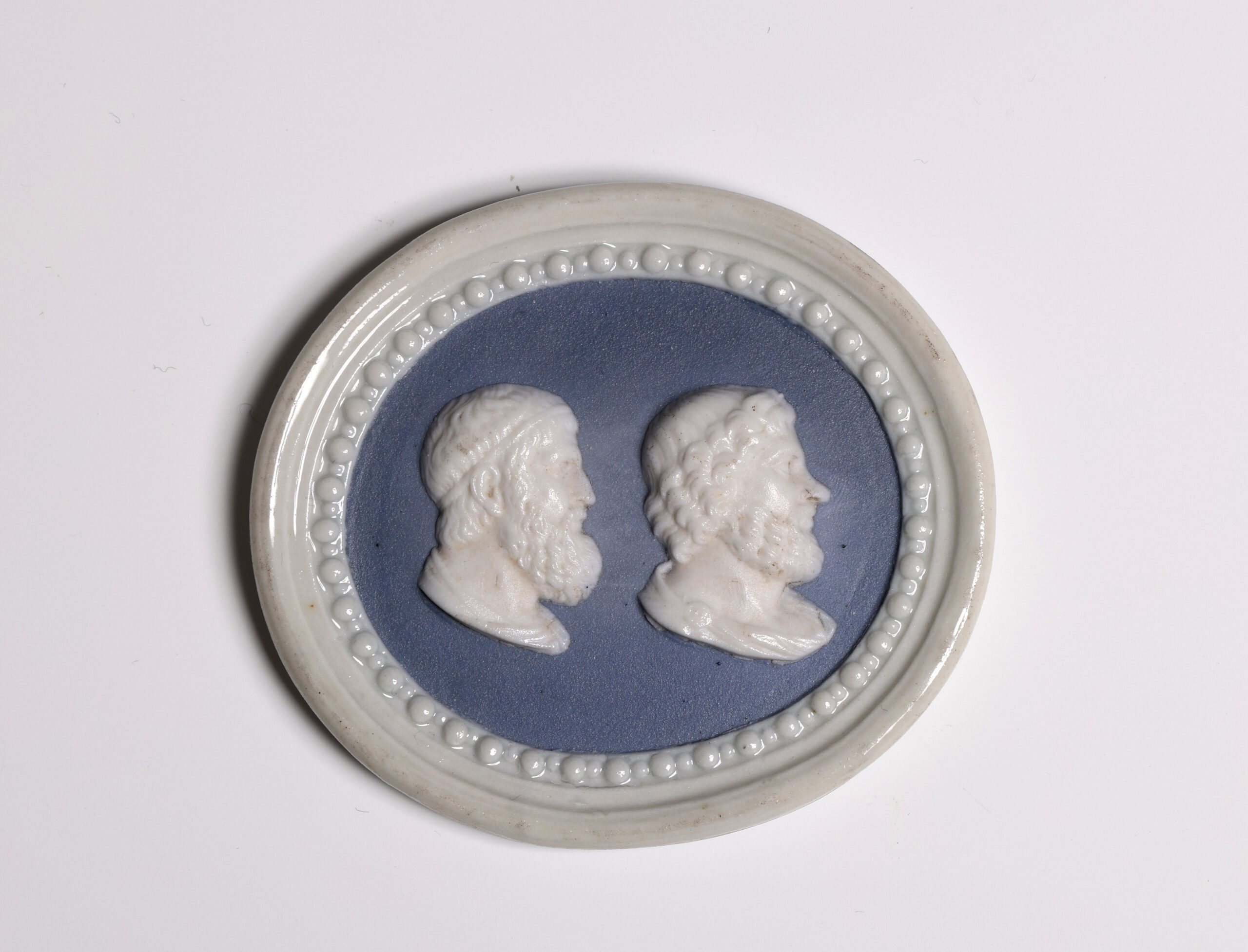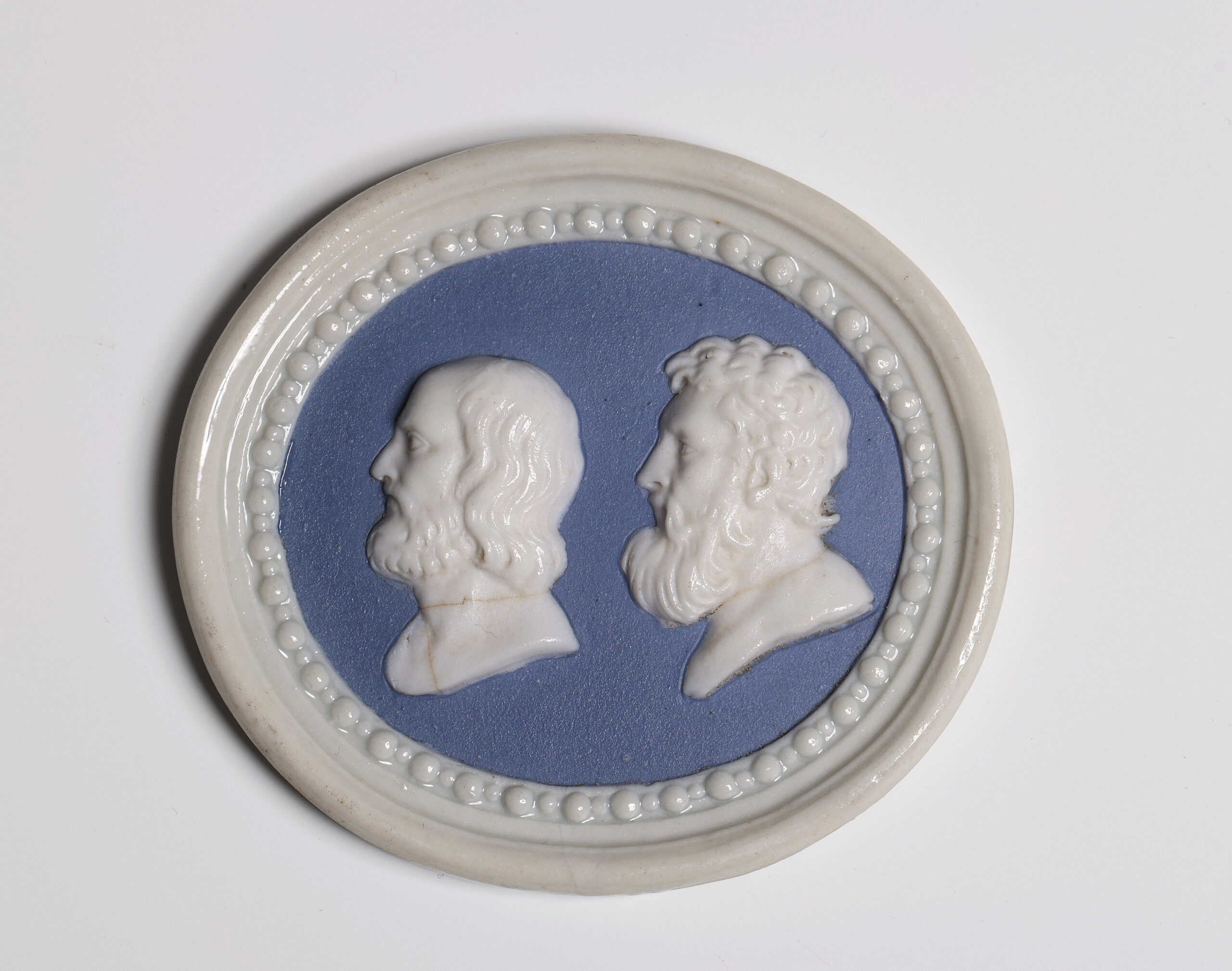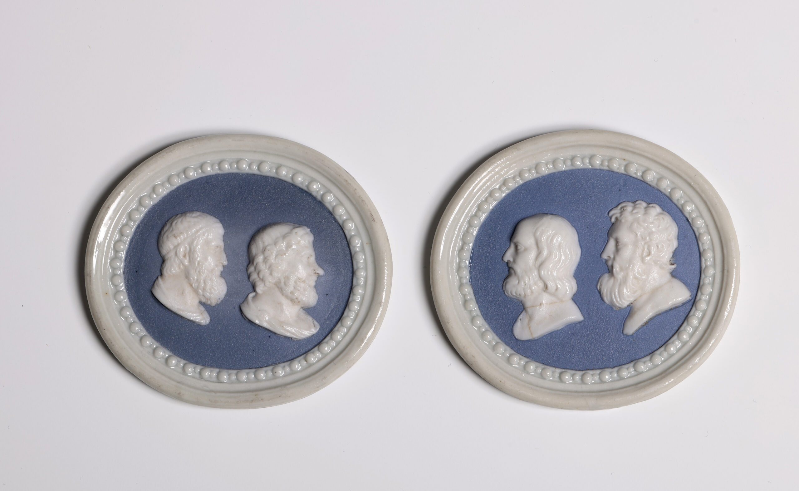 Each applied with two profile busts of Ancient Greeks, one with the astronomers Archimedes and Aristyllus, the other with the poets Epimenides and Hesiod, on a blue ground within a beaded moulded and glazed white frame, pierced for suspension.