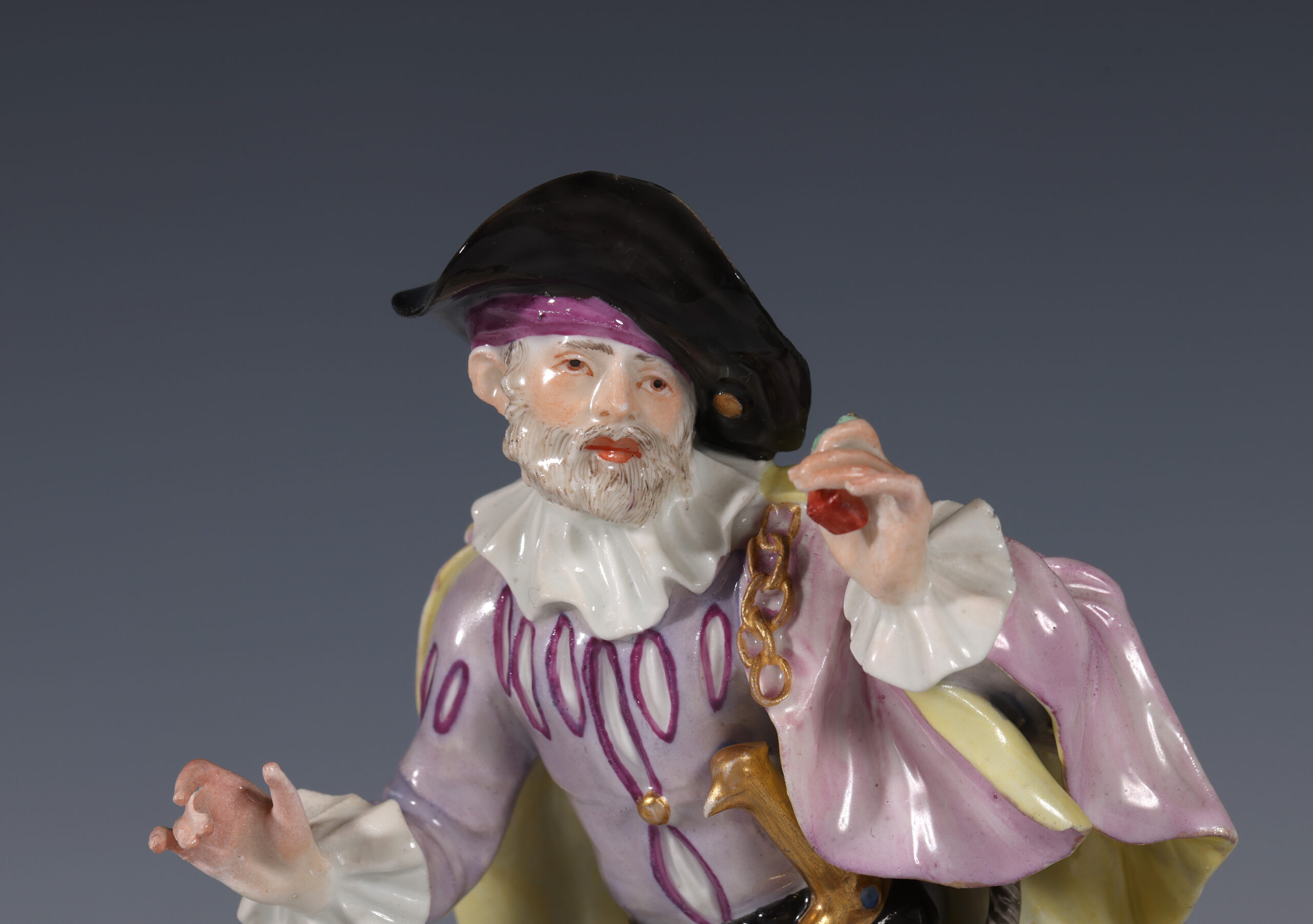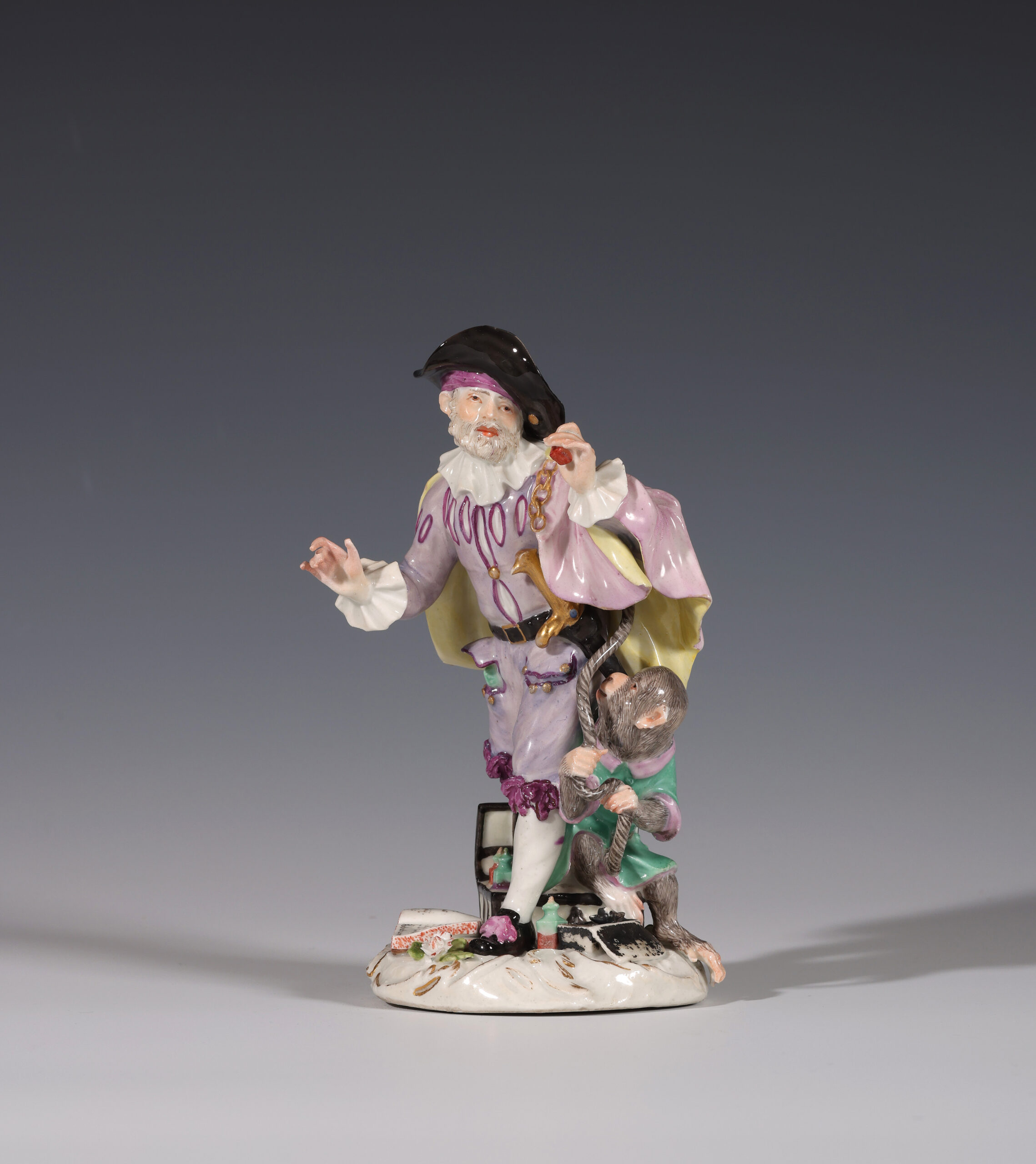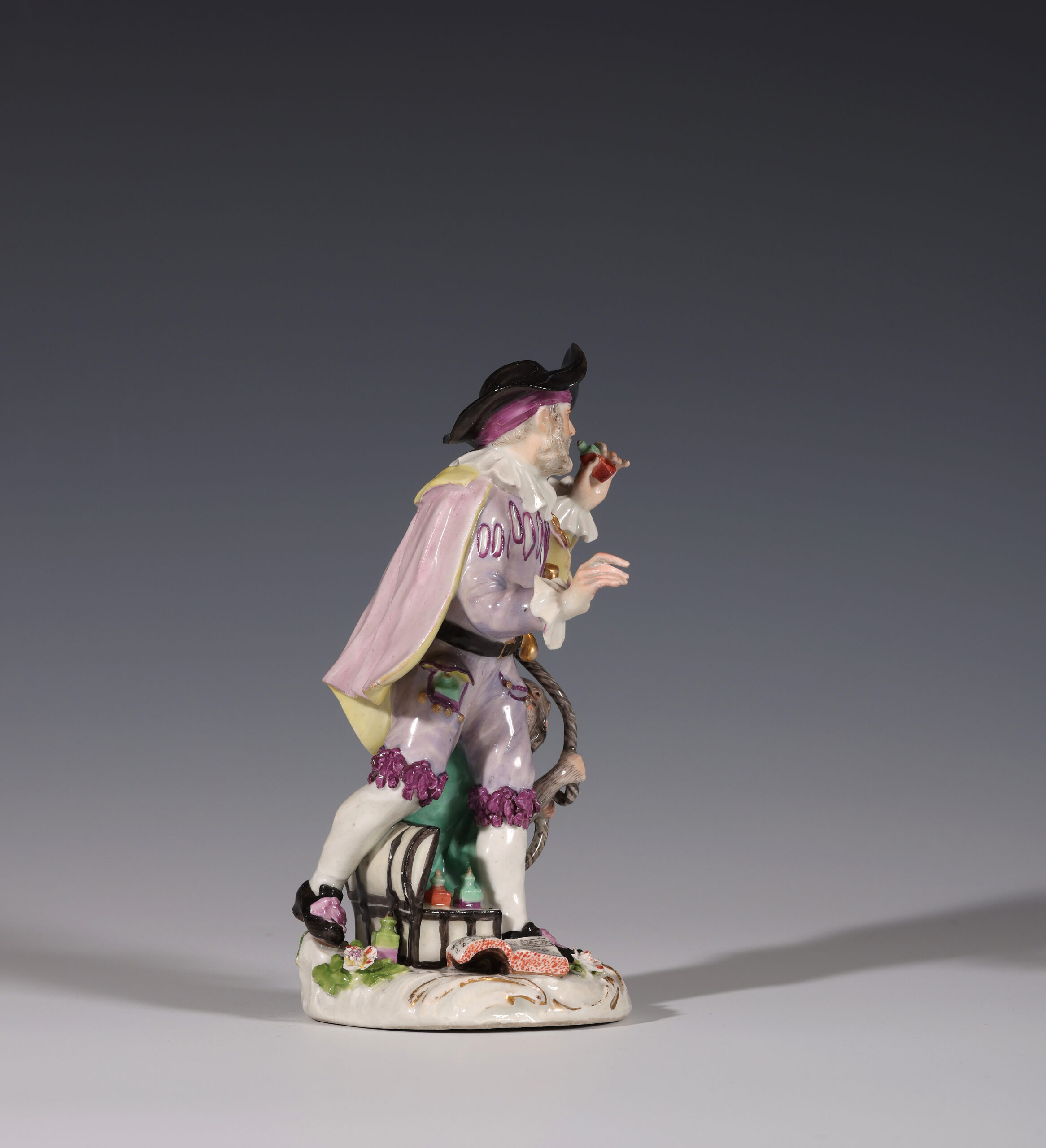 Unlike Meissen’s two series of the Cris de Paris and the smaller set of St. Petersburg Criers, the London Criers vary in scale and so were evidently not conceived as a coherent series but as individual models or pairs. The Quack Doctor or Mountebank is the most elaborate, along with the Seller of Trinkets, and dramatic of the series.
