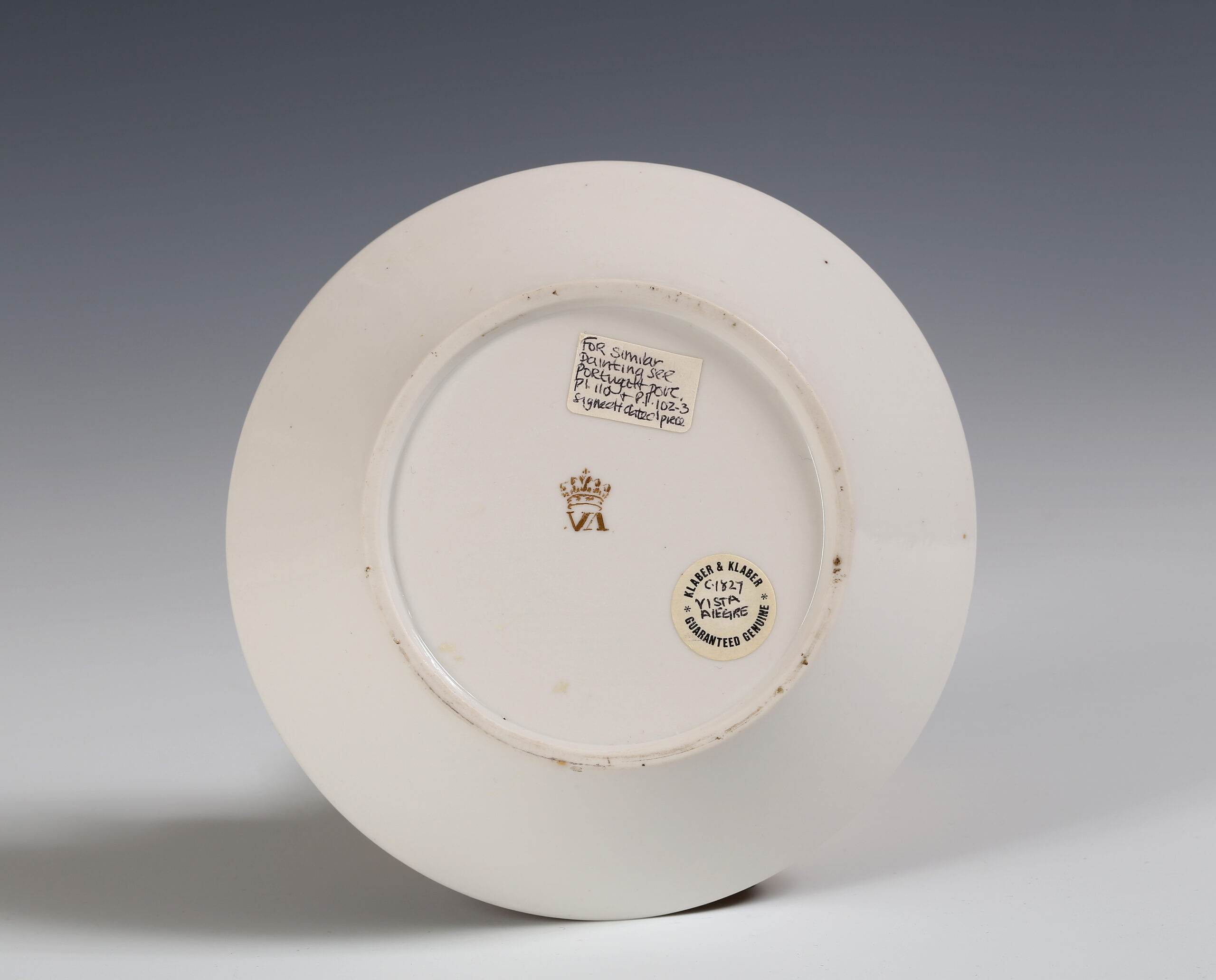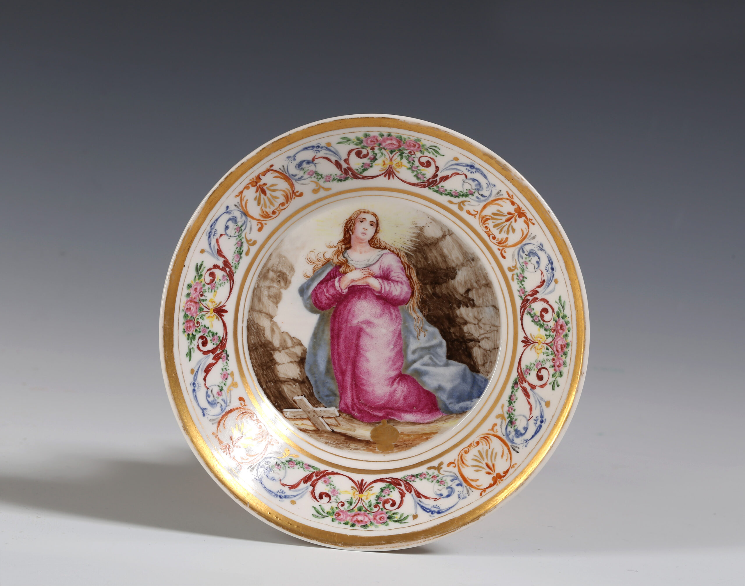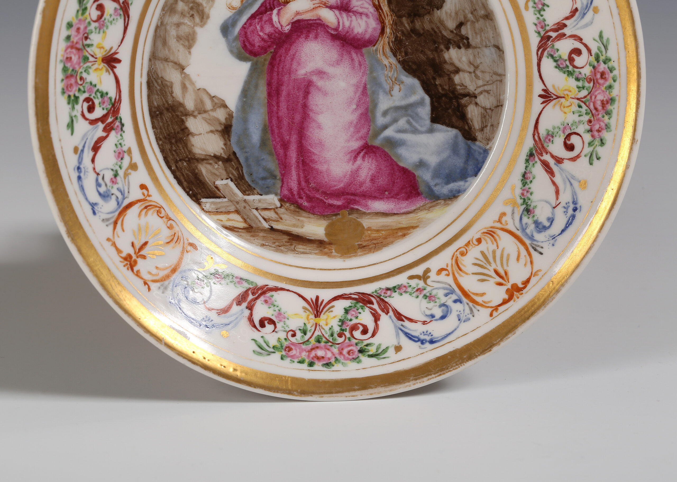 The saucer painted in the well with a kneeling figure of Mary Magdalene, dressed in a pink long robe with a blue cape, before a cross. A jar painted in gold in front of her, behind her an open tomb. Faint traces of a halo around her head. The border painted with swags of garlands of flowers. The rim and well with a gold band.