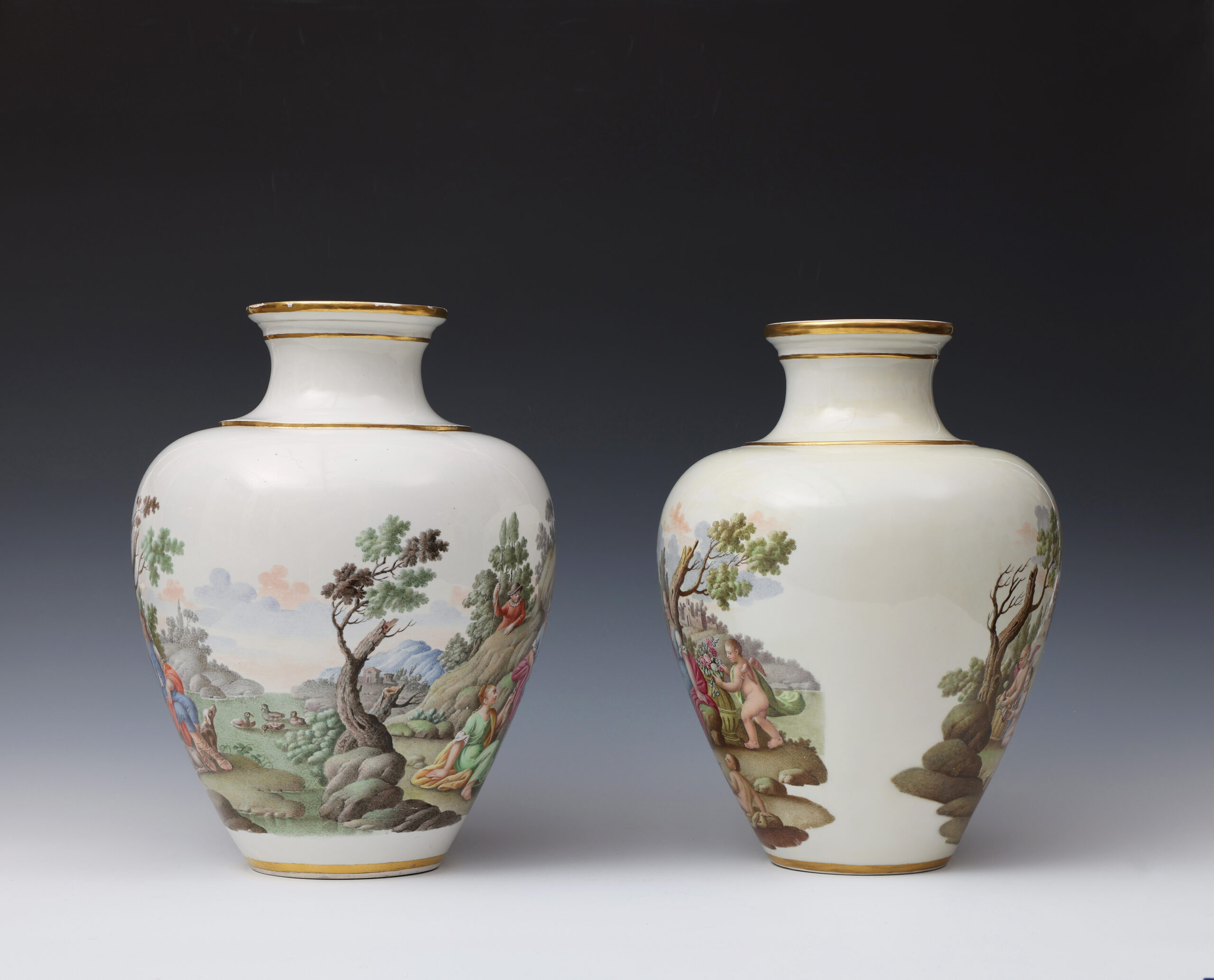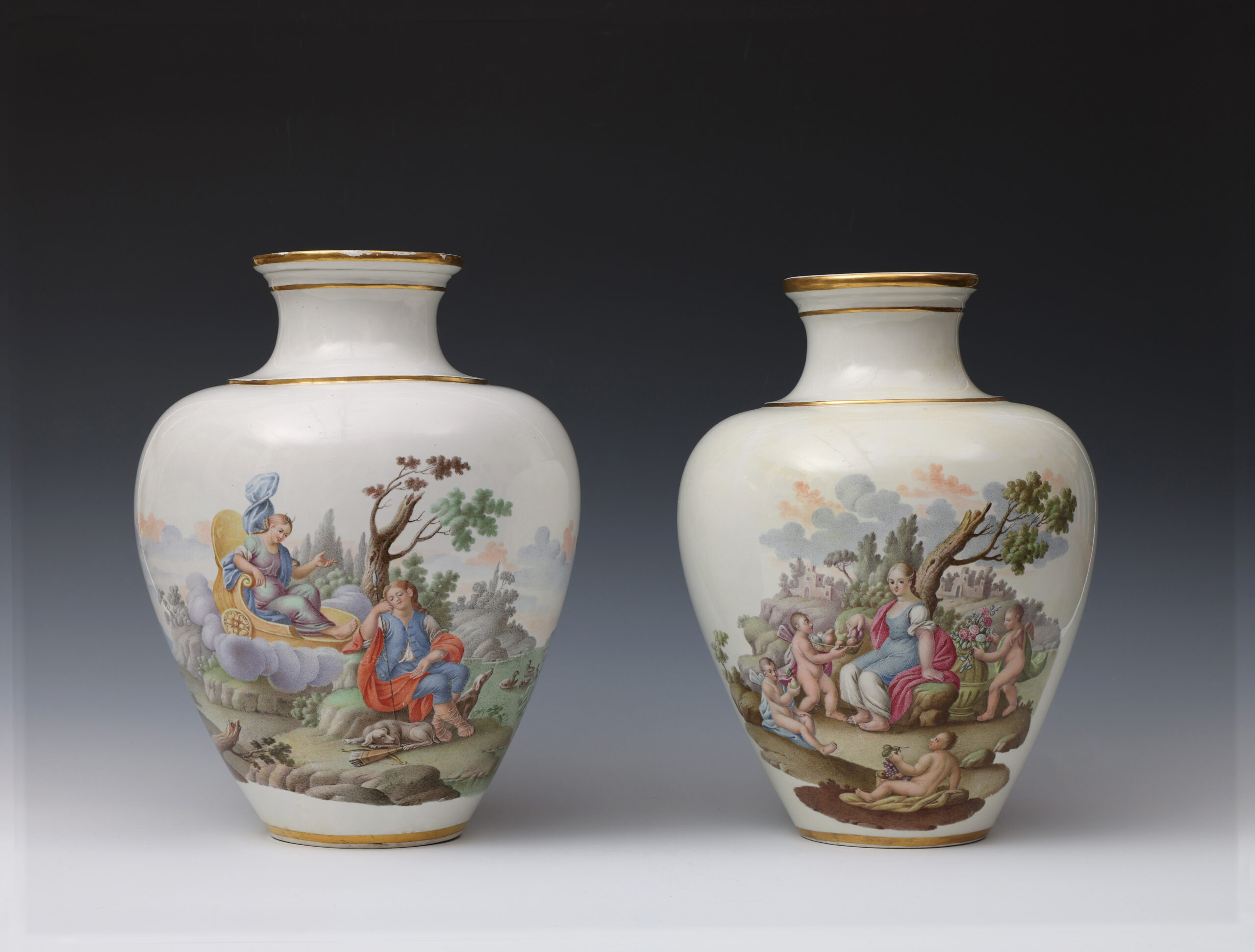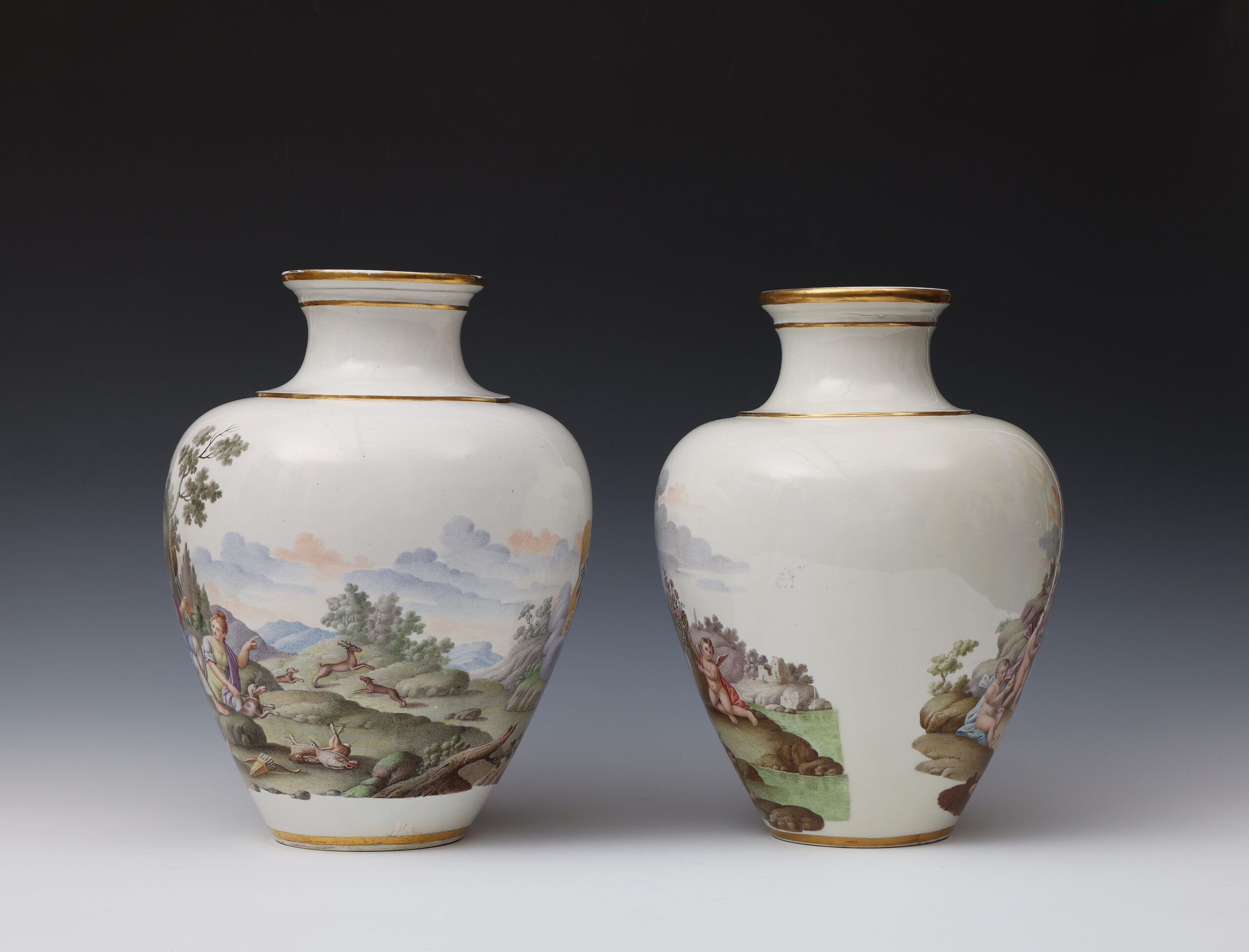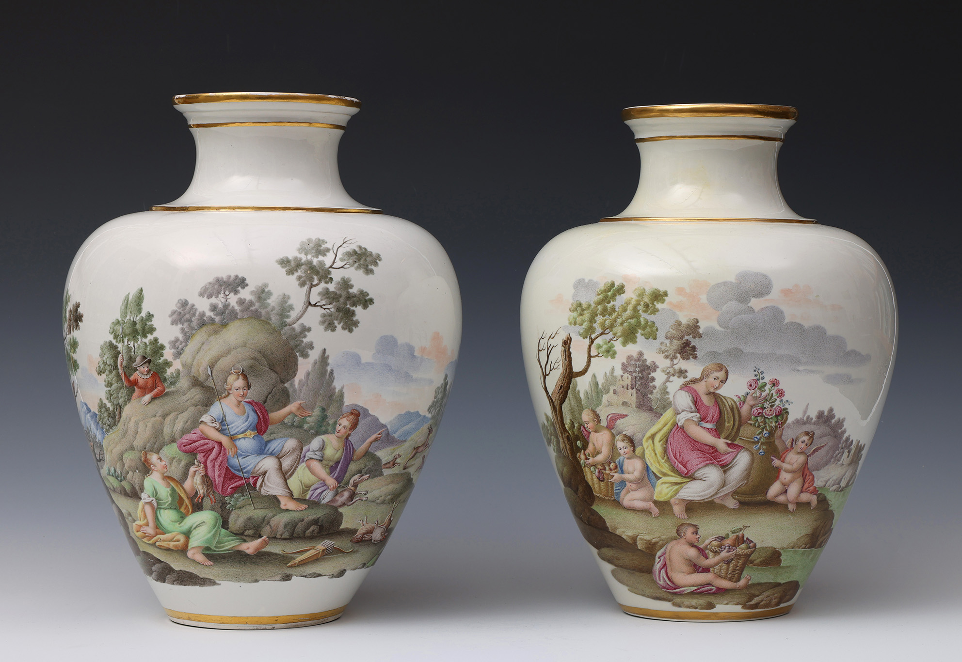 These two finely painted vases are a near pair but differ in that the vase with Diana and Endymion has two scenes in a continuous landscape, whilst on the other vase the depiction of Flora and Ceres is portrayed in two separate scenes.