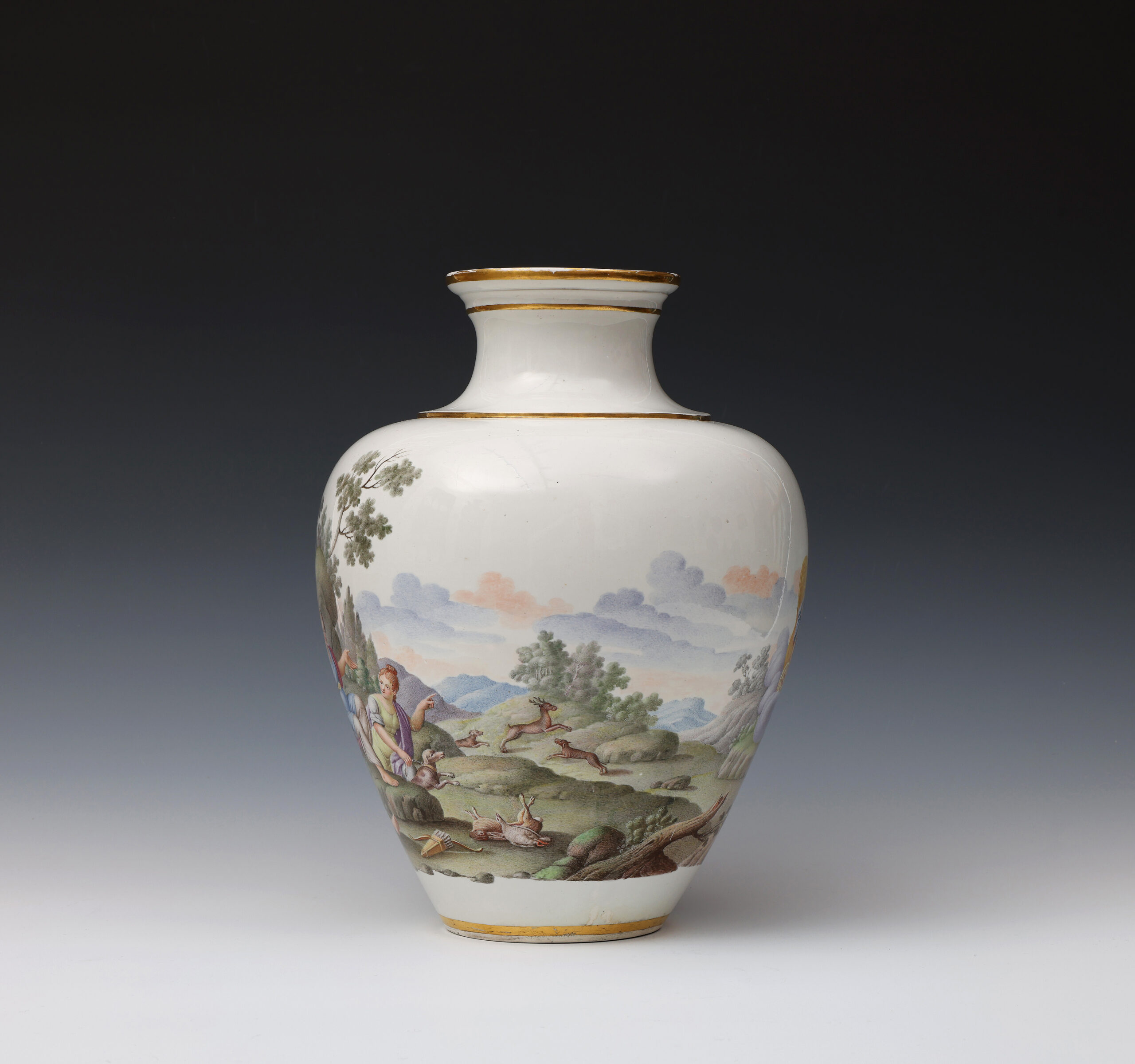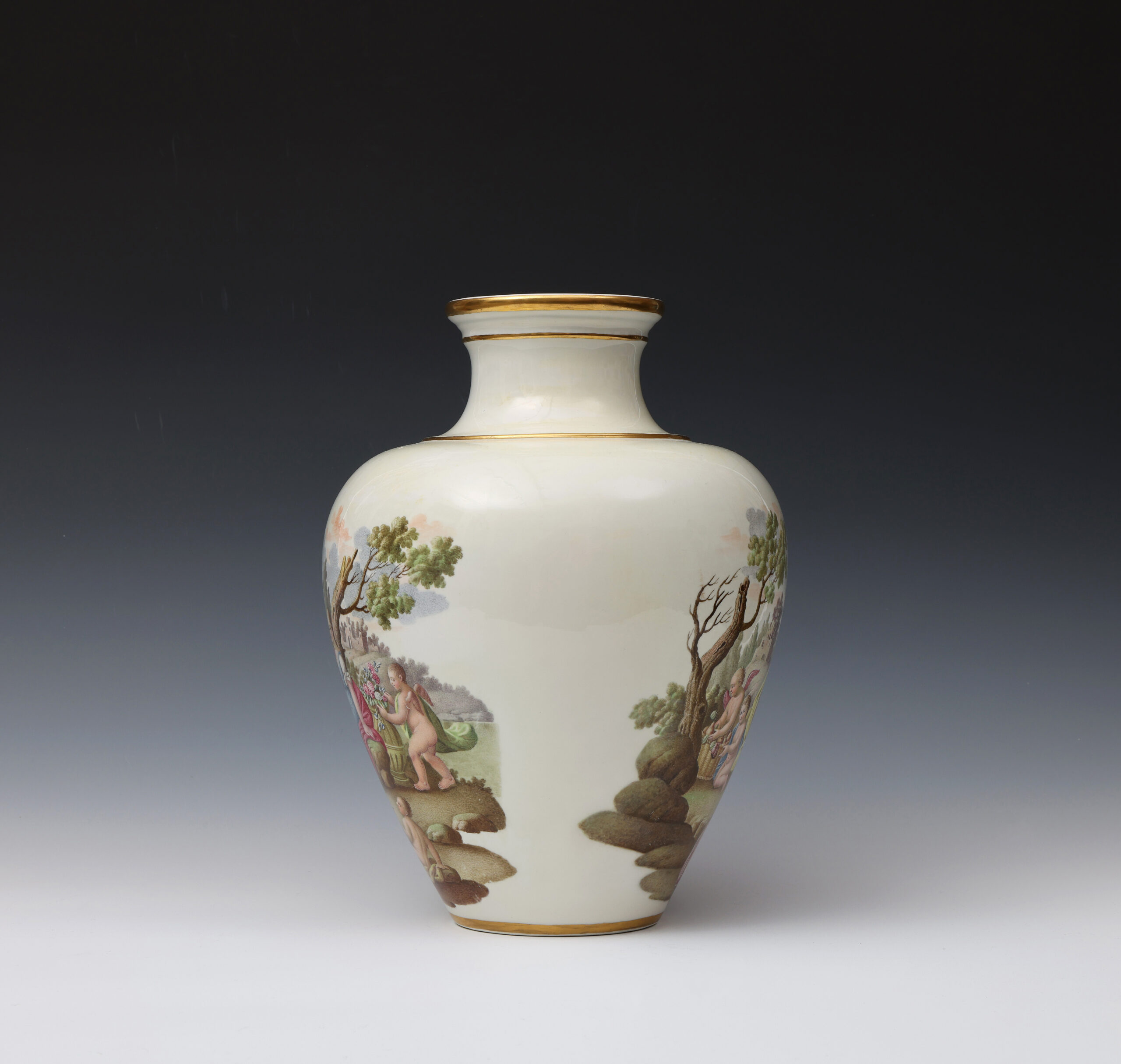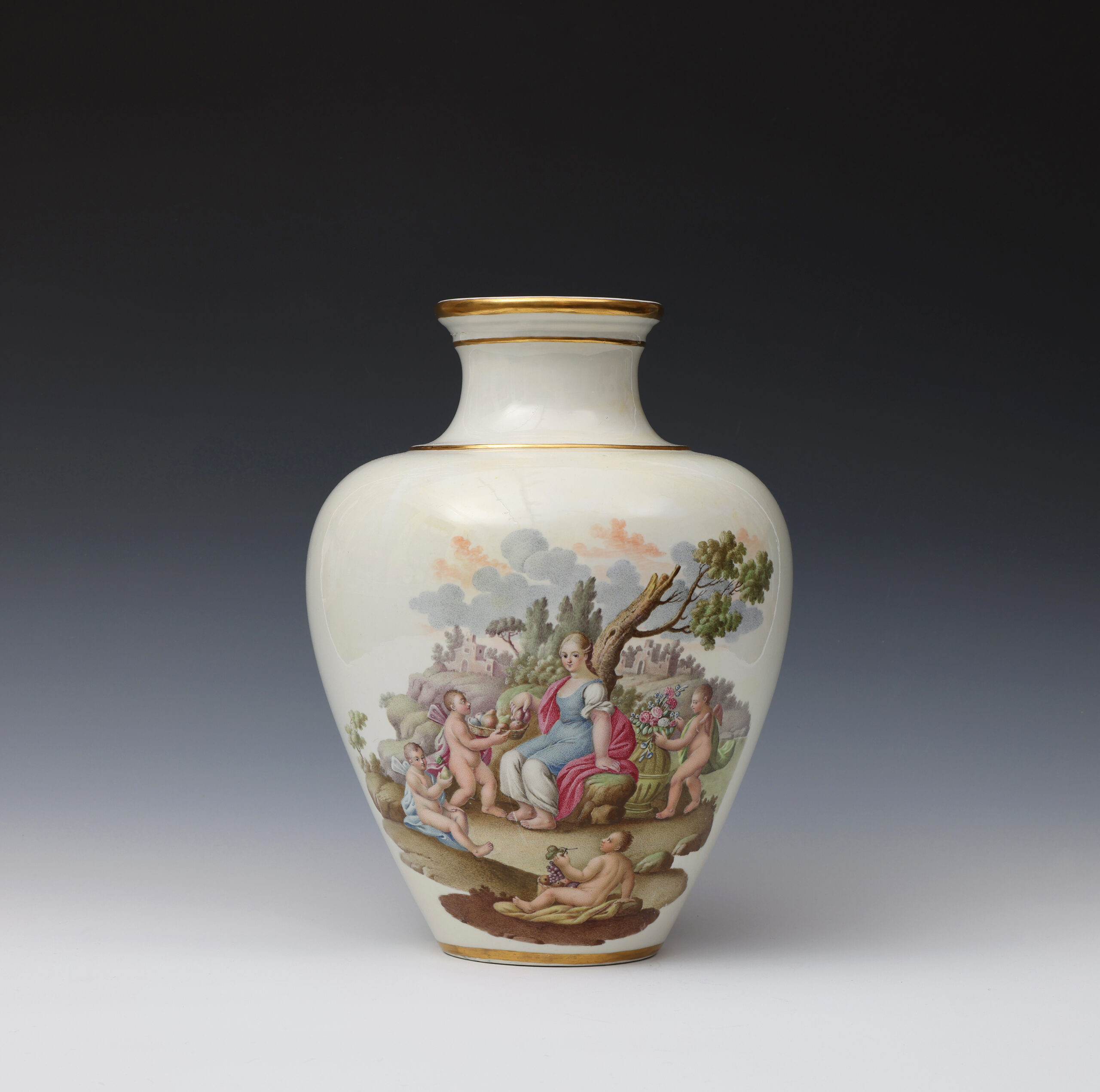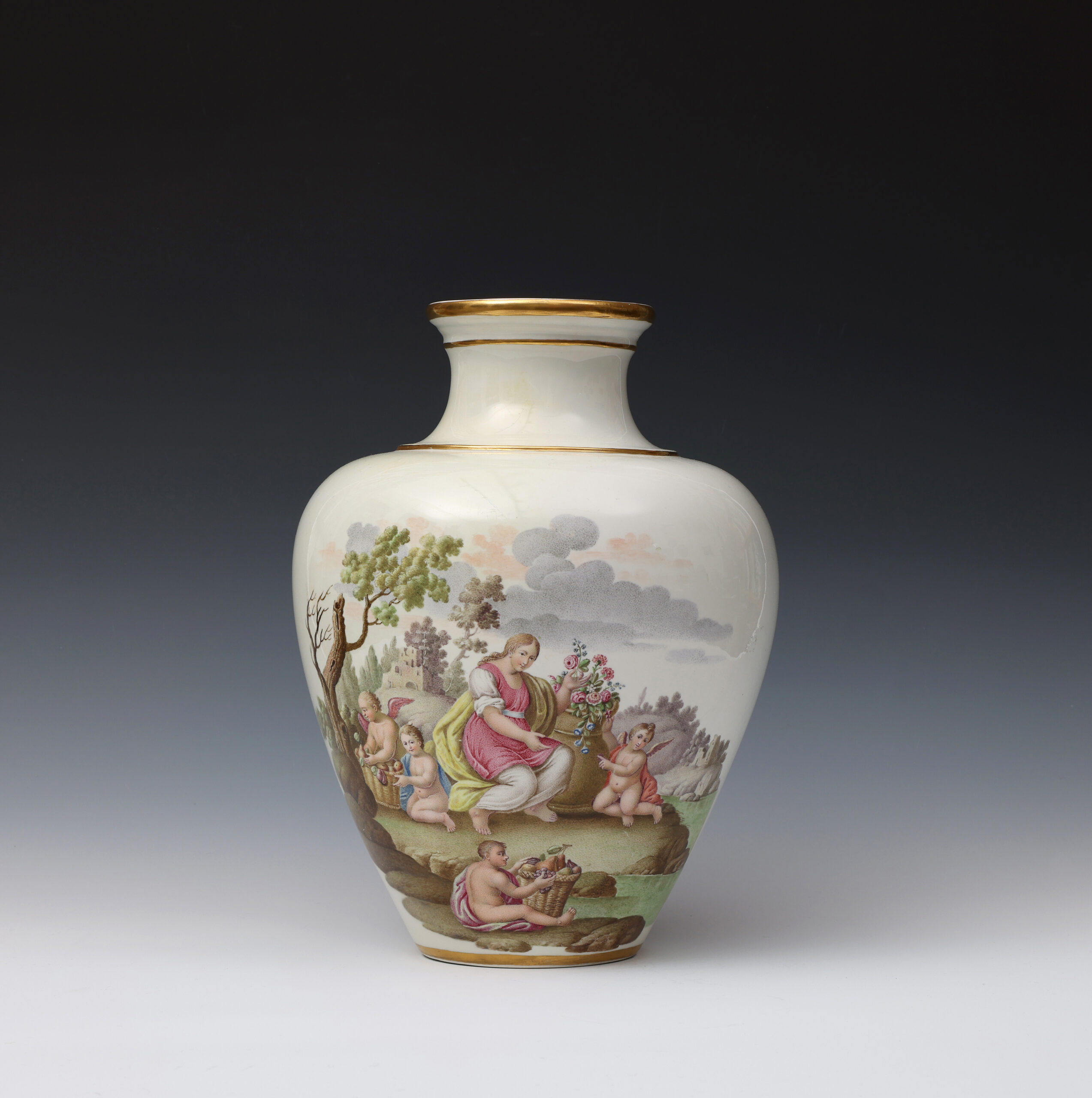 These two finely painted vases are a near pair but differ in that the vase with Diana and Endymion has two scenes in a continuous landscape, whilst on the other vase the depiction of Flora and Ceres is portrayed in two separate scenes.