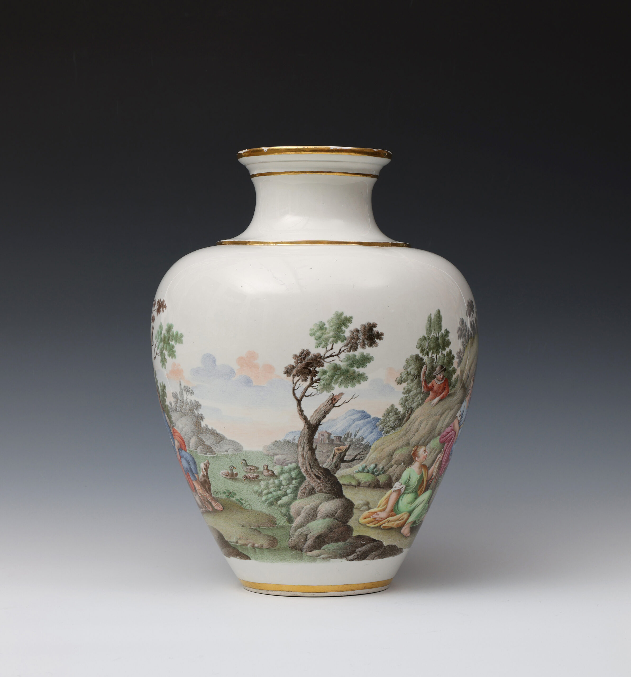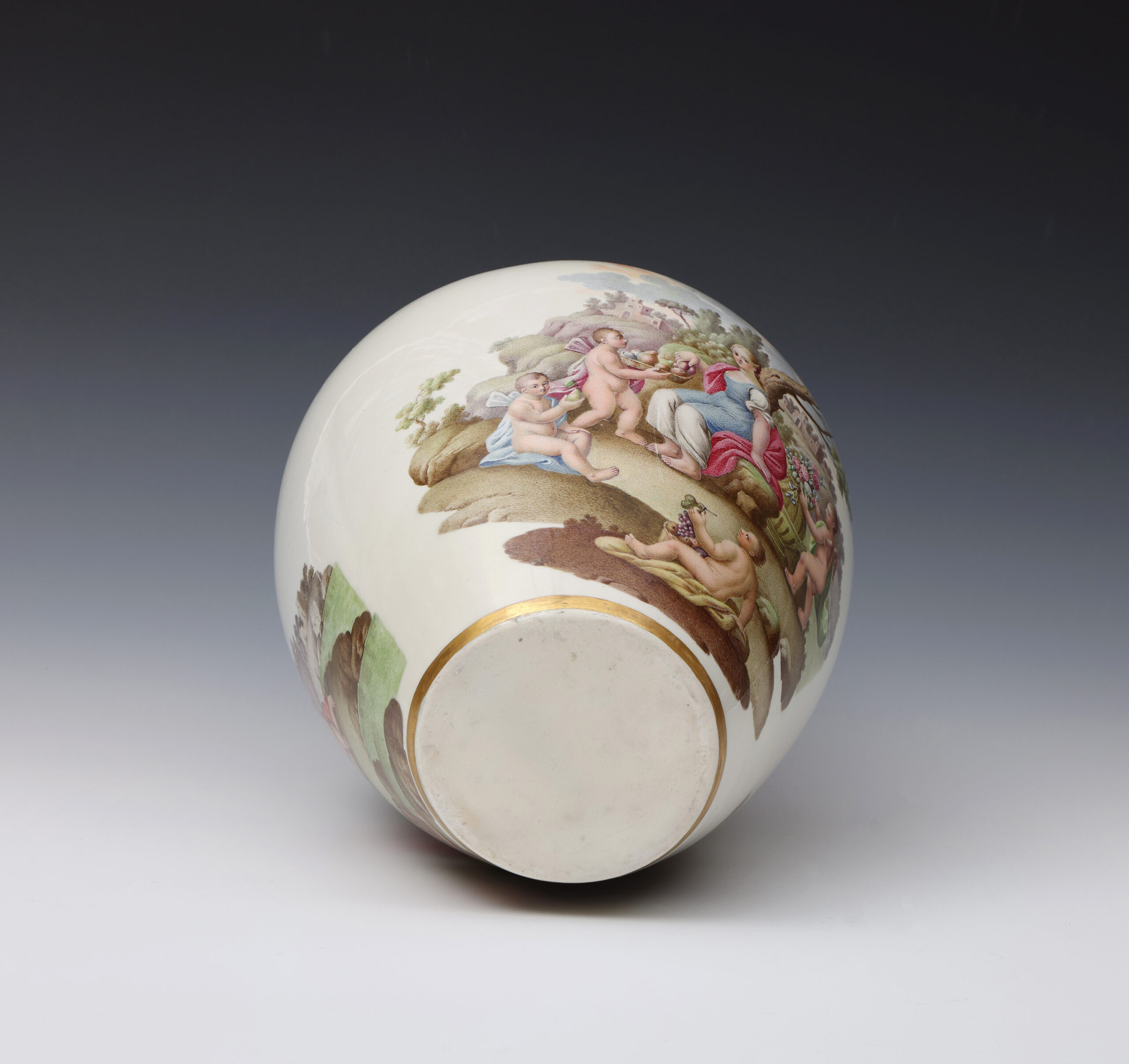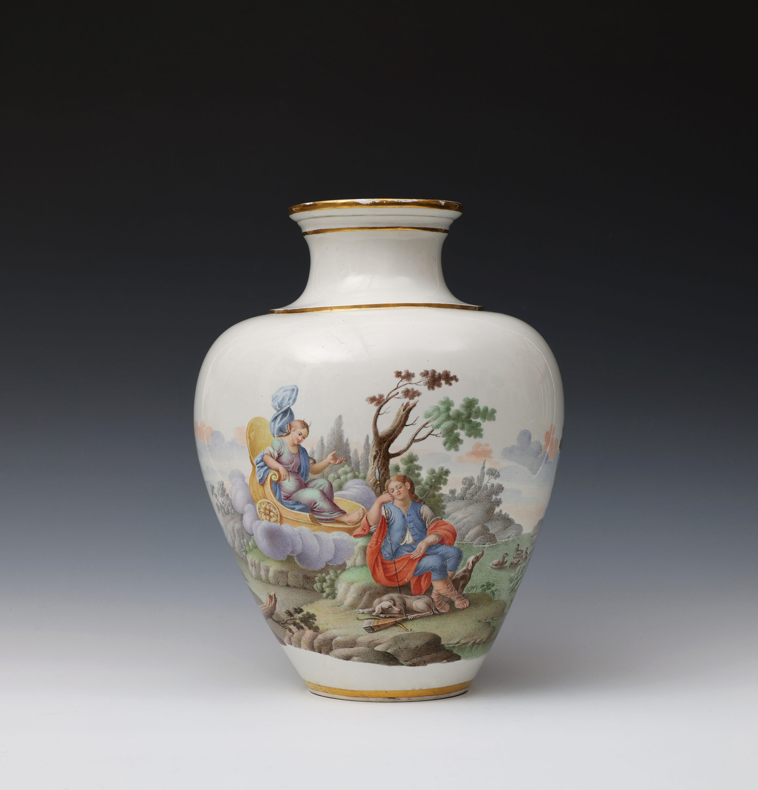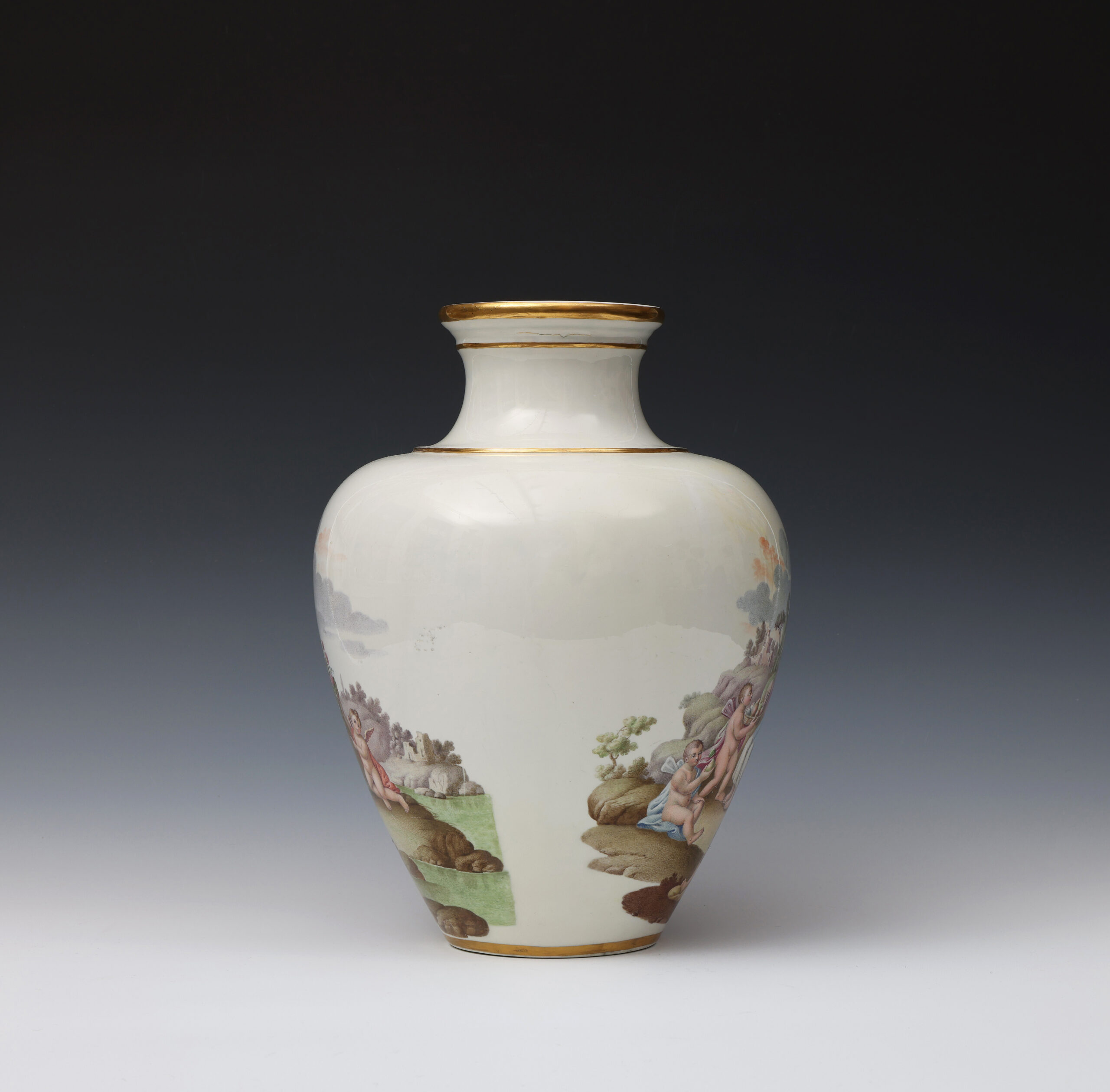 These two finely painted vases are a near pair but differ in that the vase with Diana and Endymion has two scenes in a continuous landscape, whilst on the other vase the depiction of Flora and Ceres is portrayed in two separate scenes.