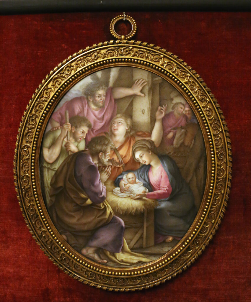 The painting applied in minute ‘pointillist’ dots and the rounded features of the faces bears some similarities to a Buen Retiro plaque of the Holy Family in the Instituto de Valencia de Don Juan in Madrid which is inscribed “RL. Fca. de Porcelana de Su MD. Católica en el Buen Retiro – 1798”,[i] the lighter palette of our vases suggests an earlier date. The dense and scarcely translucent soft paste indicates a date towards the last quarter of the 18th century before the introduction of hard paste porcelain in around 1803.