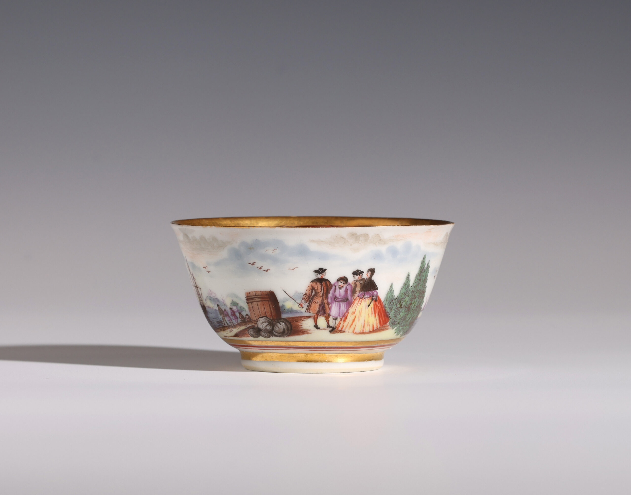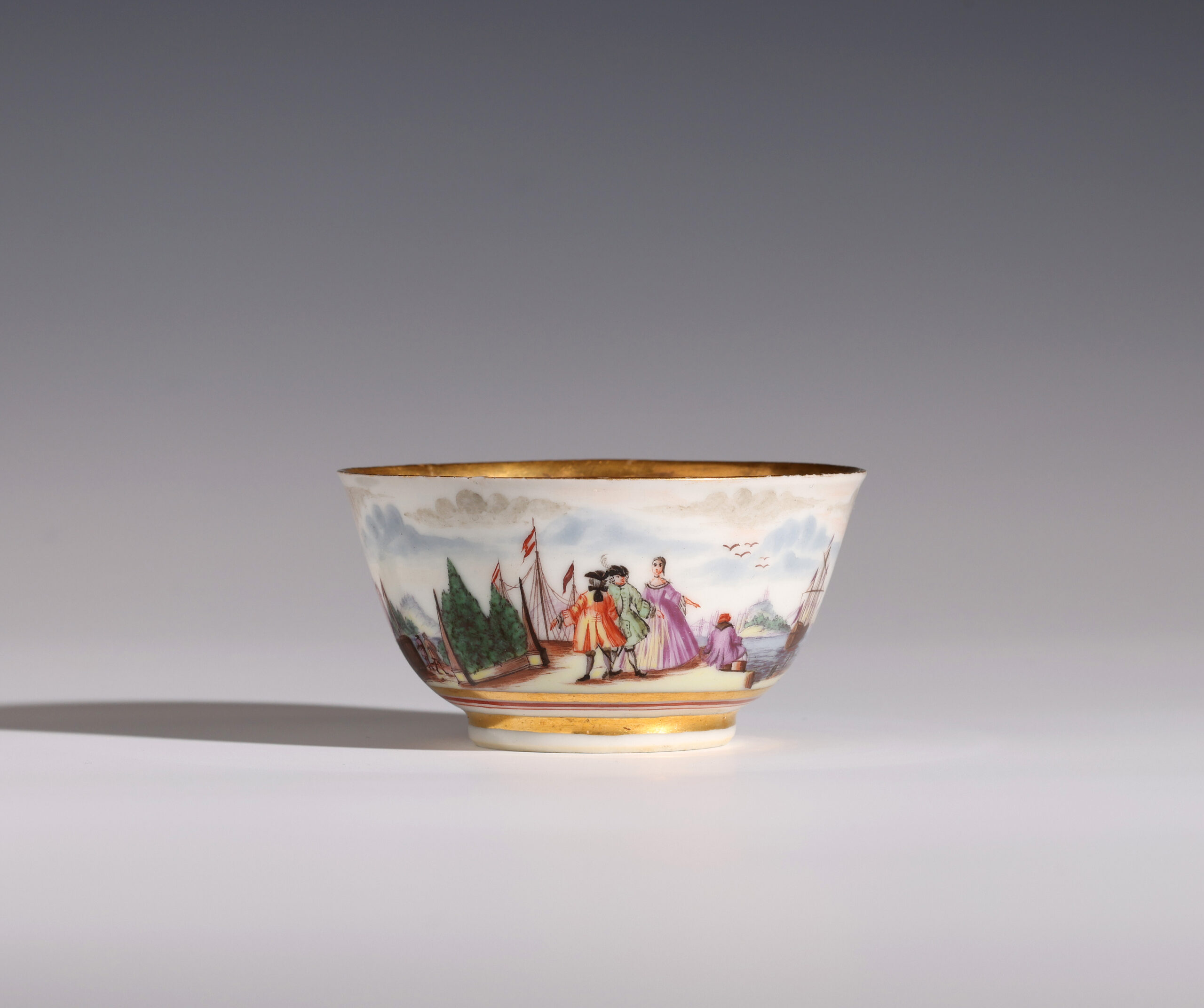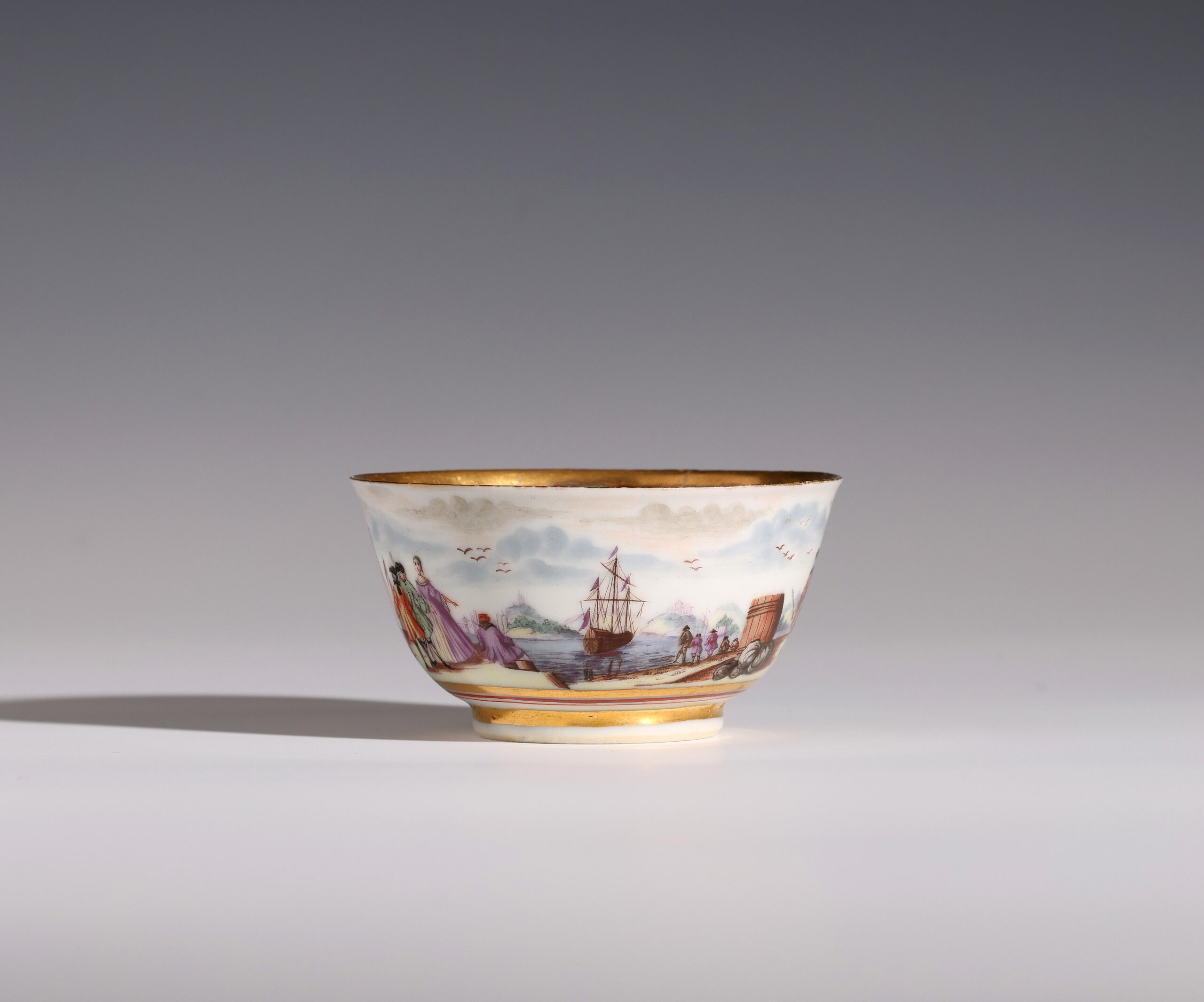 Painted with a continuous harbour scene to the exterior. The inside rim with shells fish and drapery, the centre of the bowl with a bird on a flowering branch.