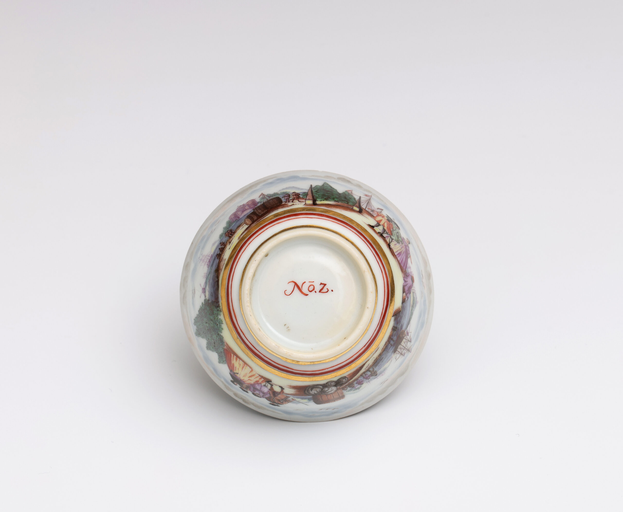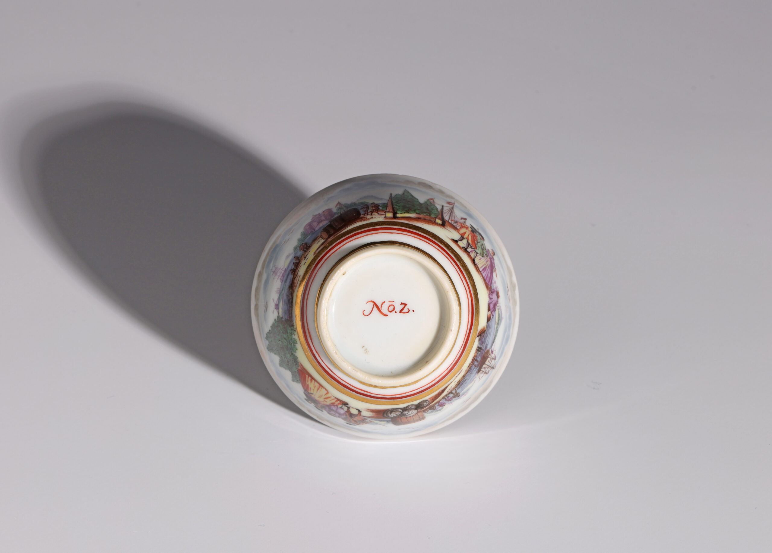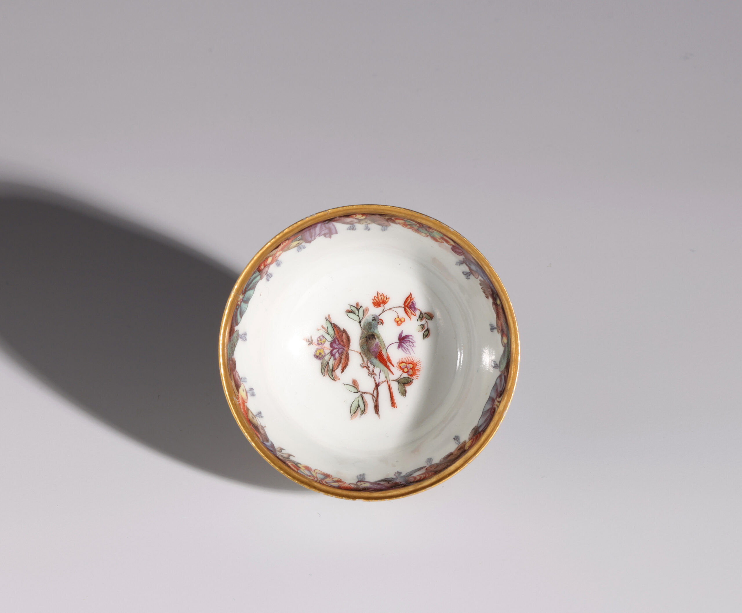 This teabowl is likely to have been part a group that was sold in the Darmstaedter Collection, bearing the same unusual fish decoration on the inside rim, similar marks on the base, and sharing many other features. The group illustrated in the Darmstaedter Collection is dated 1744, and contains one piece that has been a source of confusion – a bowl inscribed ‘de Dreschell 1744’. W. B. Honey believed that this inscription referred not to the painter but to the ownership’, which seems likely to be the case.